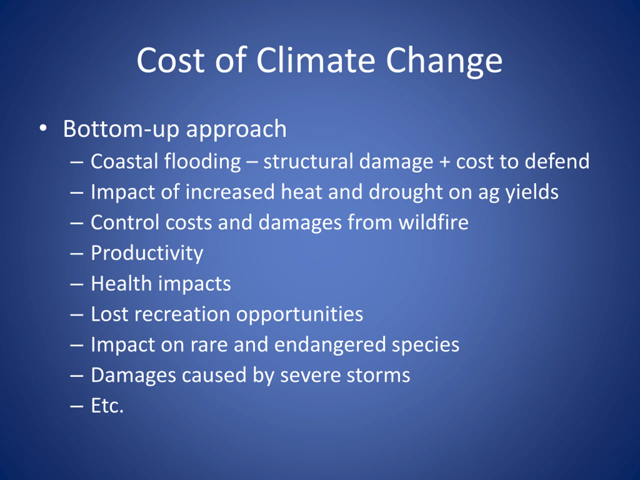 Cost of Climate Change Bottom-up approach Coastal flooding structural damage + cost to defend Impact of increased heat and drought on ag yields Control costs and damages from wildfire Productivity Health impacts Lost recreation opportunities Impact on rare and endangered species Damages caused by severe storms Etc.