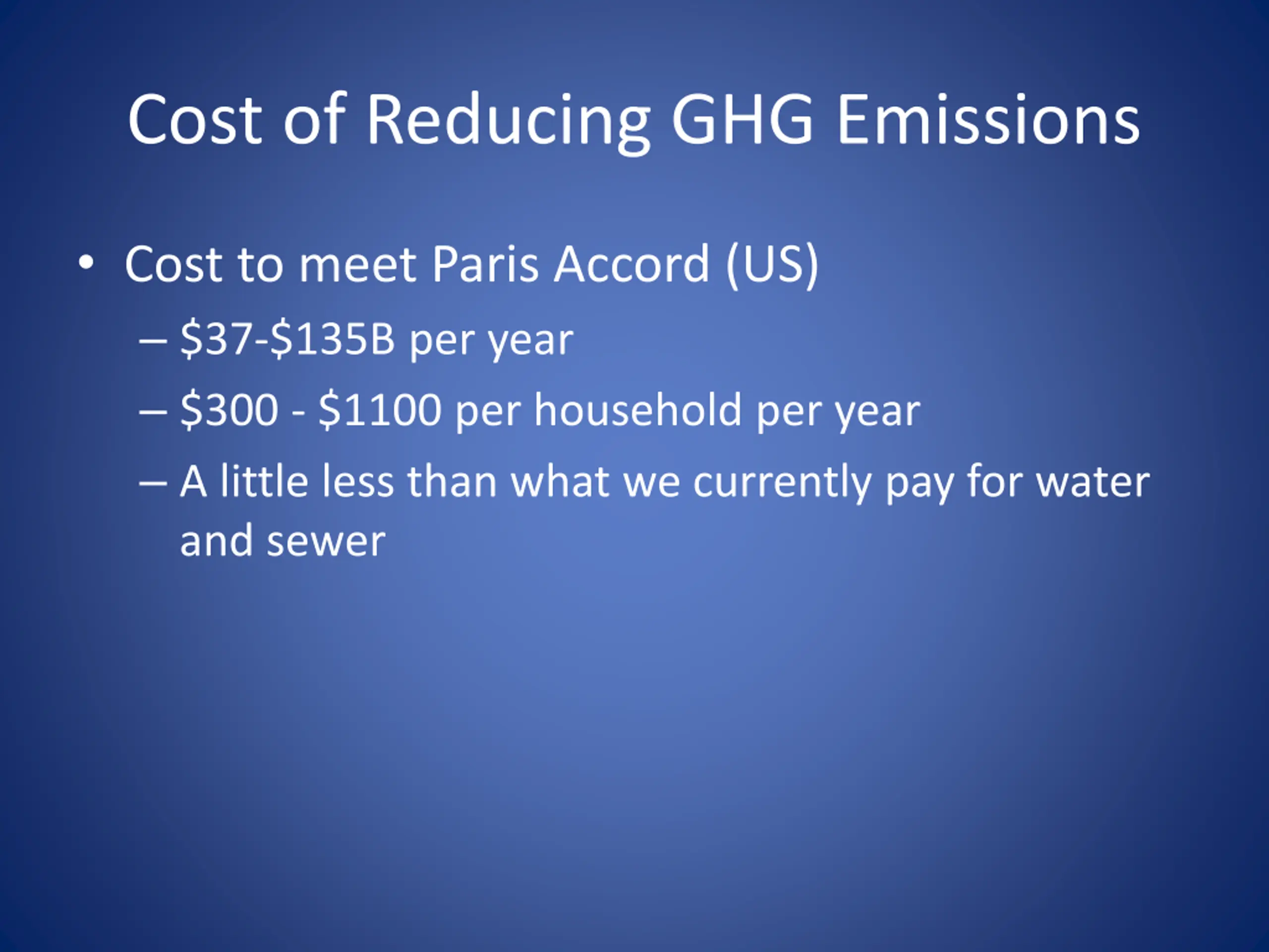 Cost of Reducing GHG Emissions Cost to meet Paris Accord (US) $37-$135B per year $300 - $1100 per household per year A little less than what we currently pay for water and sewer