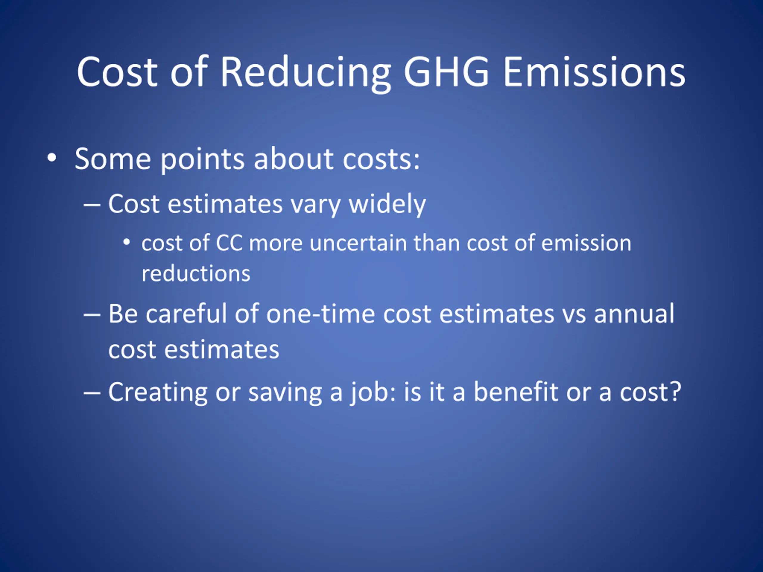 Cost of Reducing GHG Emissions Some points about costs: Cost estimates vary widely cost of CC more uncertain than cost of emission reductions Be careful of one-time cost estimates vs annual cost estimates Creating or saving a job: is it a benefit or a cost?