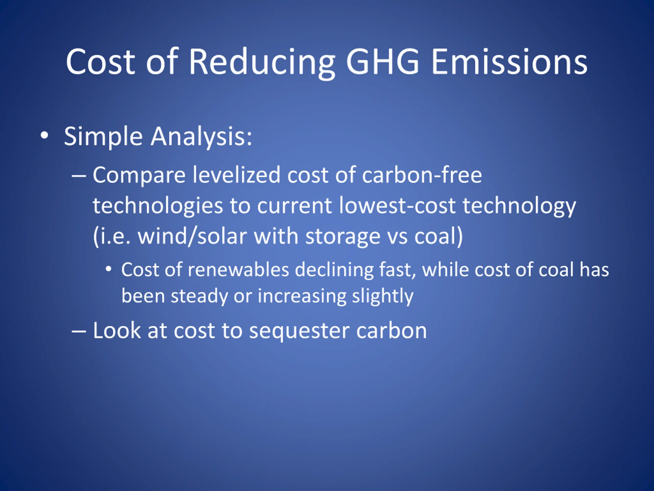 Cost of Reducing GHG Emissions Simple Analysis: Compare levelized cost of carbon-free technologies to current lowest-cost technology (i.e. wind/solar with storage vs coal) Cost of renewables declining fast, while cost of coal has been steady or increasing slightly Look at cost to sequester carbon