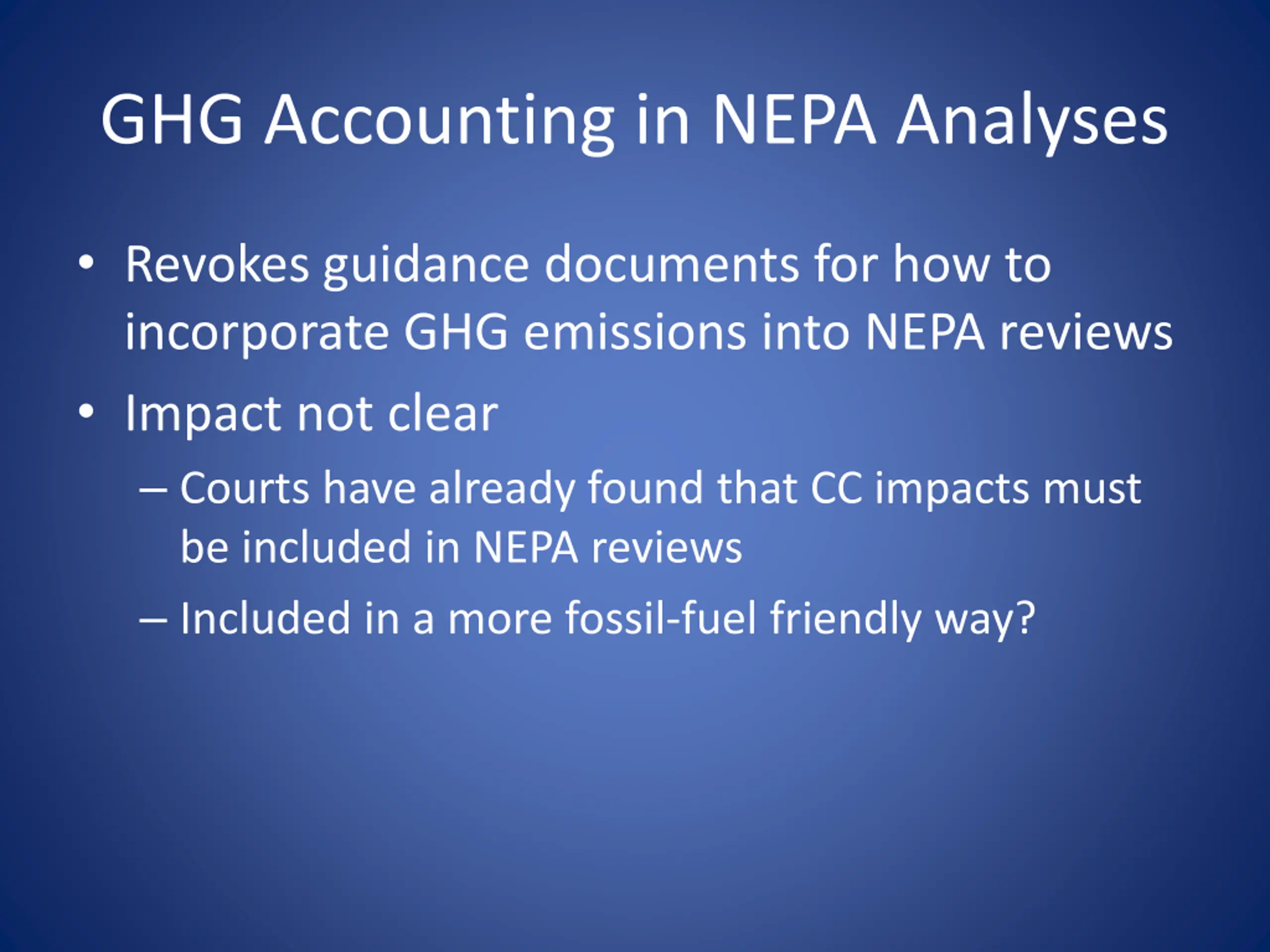 GHG Accounting in NEPA Analyses Revokes guidance documents for how to incorporate GHG emissions into NEPA reviews Impact not clear Courts have already found that CC impacts must be included in NEPA reviews Included in a more fossil-fuel friendly way?
