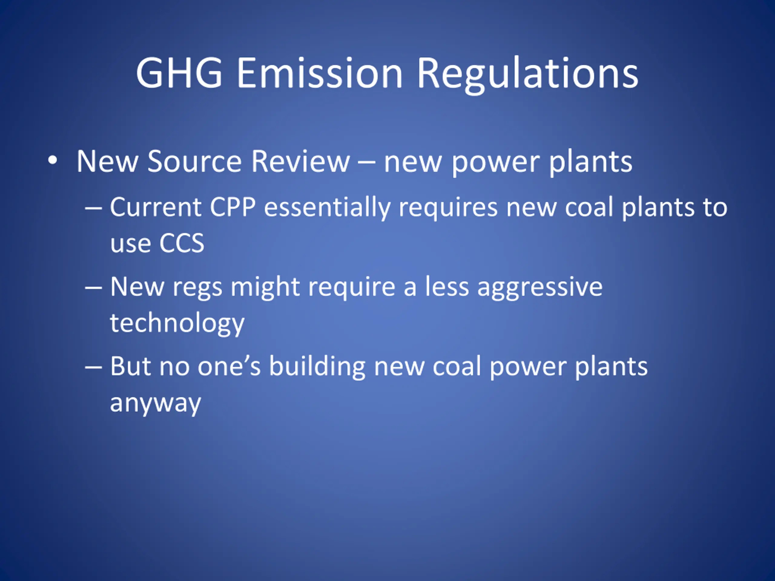 GHG Emission Regulations New Source Review new power plants Current CPP essentially requires new coal plants to use CCS New regs might require a less aggressive technology But no one s building new coal power plants anyway