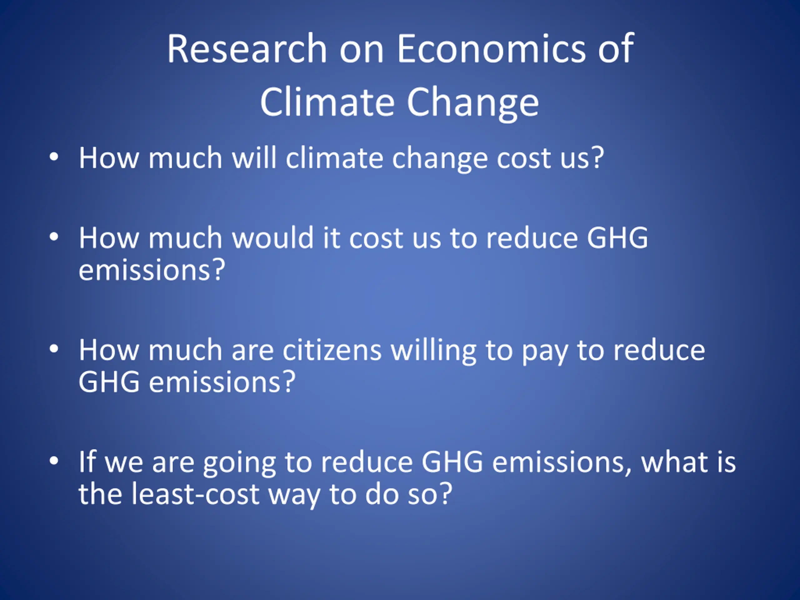 Research on Economics of Climate Change How much will climate change cost us? How much would it cost us to reduce GHG emissions? How much are citizens willing to pay to reduce GHG emissions? If we are going to reduce GHG emissions, what is the least-cost way to do so?