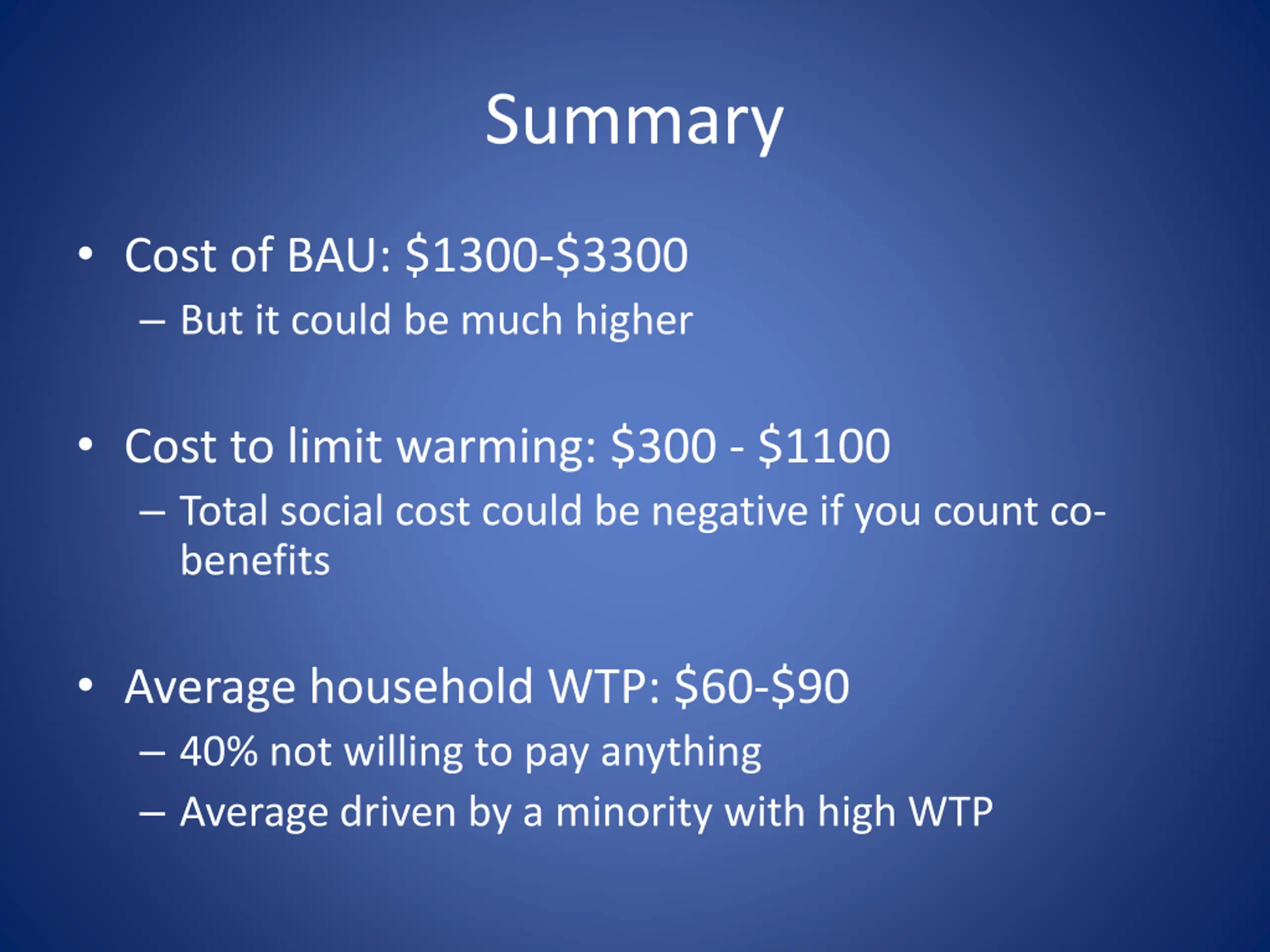 Summary Cost of BAU: $1300-$3300 But it could be much higher Cost to limit warming: $300 - $1100 Total social cost could be negative if you count co- benefits Average household WTP: $60-$90 40% not willing to pay anything Average driven by a minority with high WTP