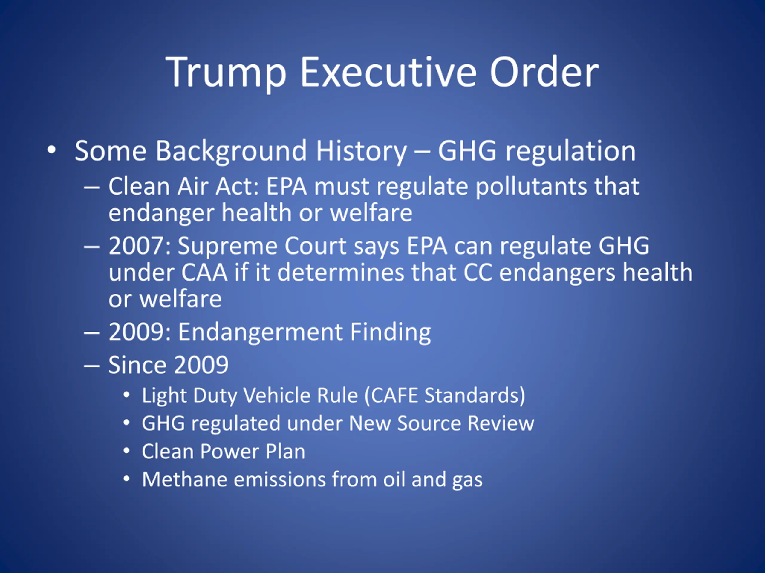 Trump Executive Order Some Background History GHG regulation Clean Air Act: EPA must regulate pollutants that endanger health or welfare 2007: Supreme Court says EPA can regulate GHG under CAA if it determines that CC endangers health or welfare 2009: Endangerment Finding Since 2009 Light Duty Vehicle Rule (CAFE Standards) GHG regulated under New Source Review Clean Power Plan Methane emissions from oil and gas