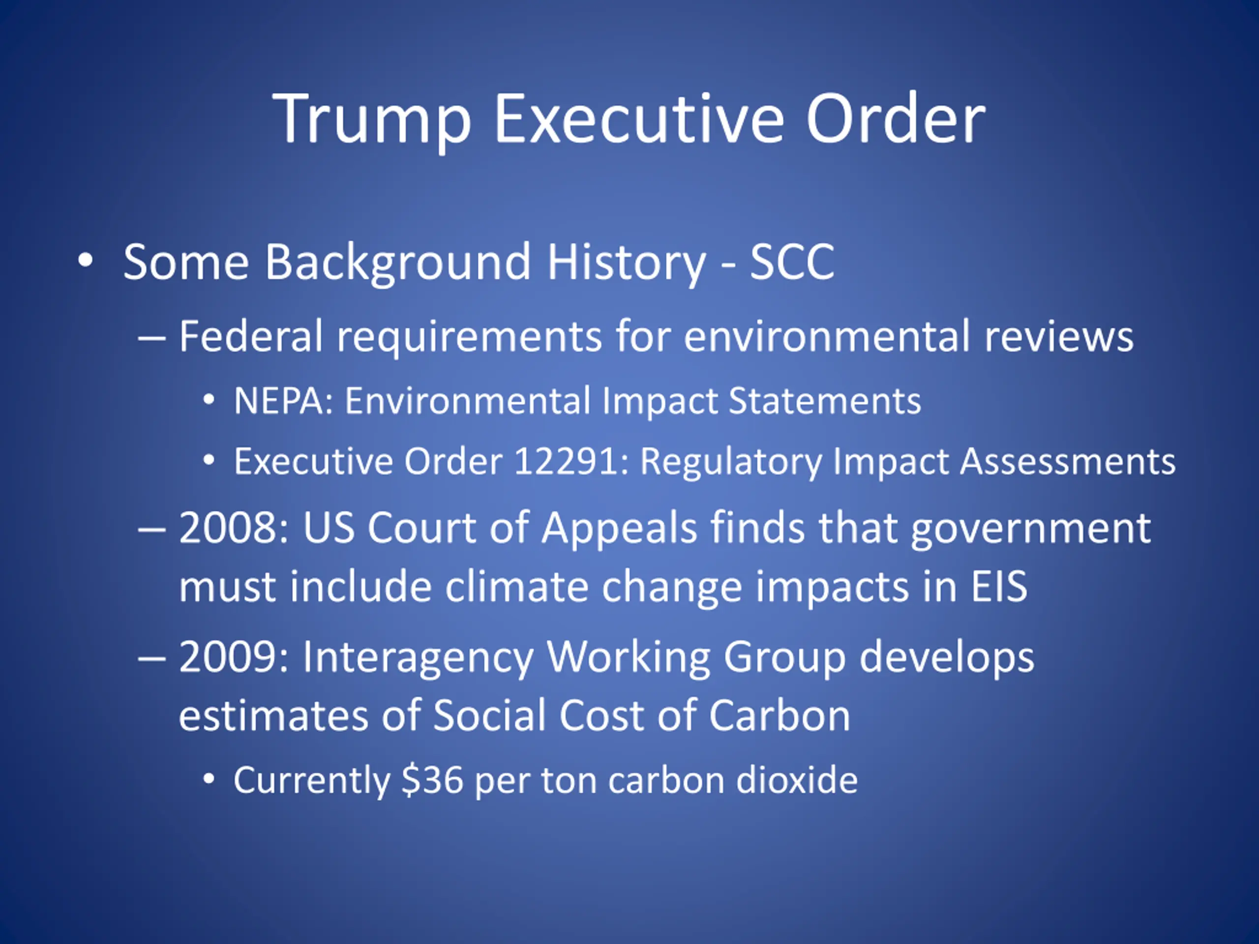 Trump Executive Order Some Background History - SCC Federal requirements for environmental reviews NEPA: Environmental Impact Statements Executive Order 12291: Regulatory Impact Assessments 2008: US Court of Appeals finds that government must include climate change impacts in EIS 2009: Interagency Working Group develops estimates of Social Cost of Carbon Currently $36 per ton carbon dioxide