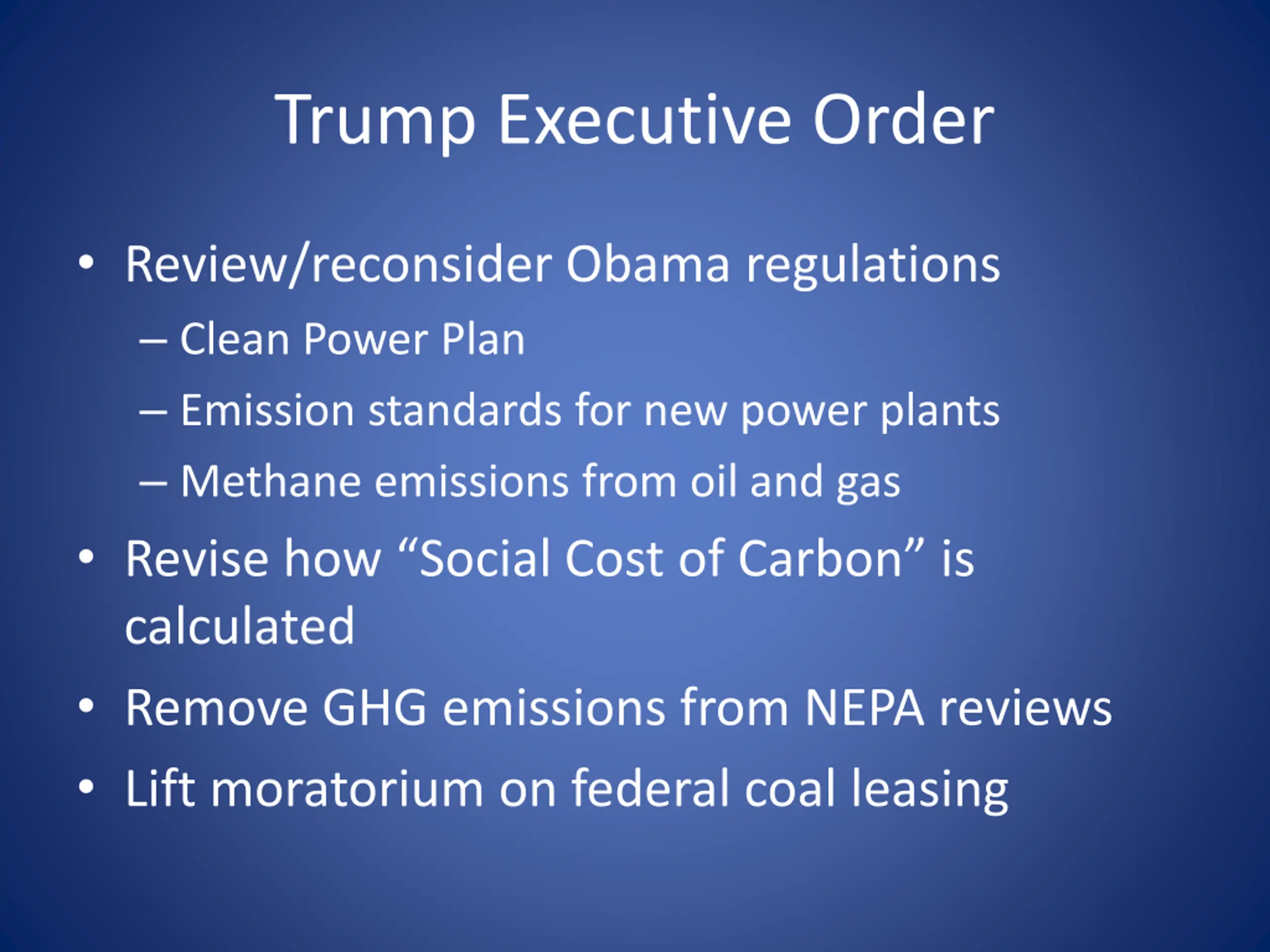 Trump Executive Order Review/reconsider Obama regulations Clean Power Plan Emission standards for new power plants Methane emissions from oil and gas Revise how Social Cost of Carbon is calculated Remove GHG emissions from NEPA reviews Lift moratorium on federal coal leasing