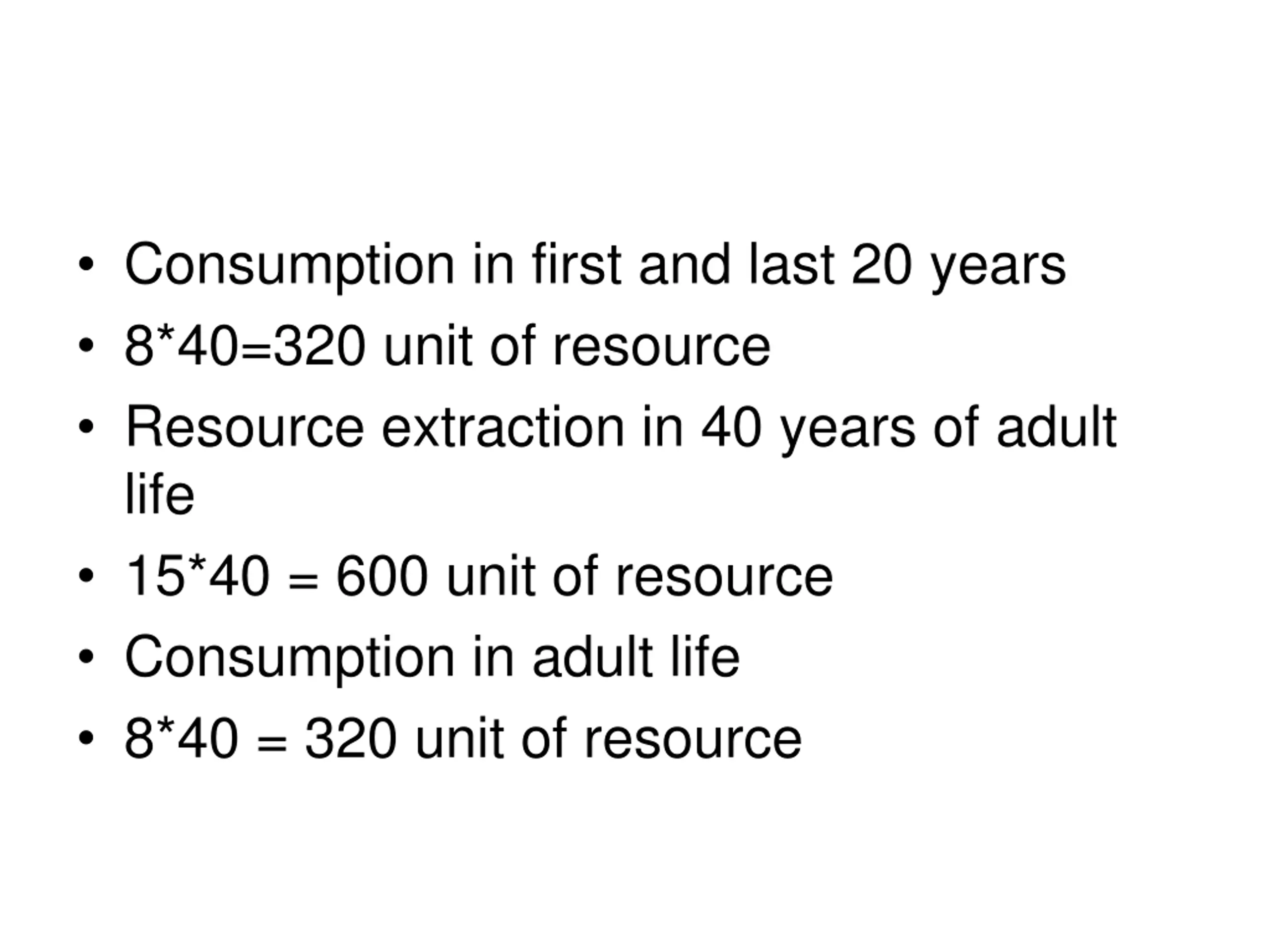 Consumption in first and last 20 years 8*40=320 unit of resource Resource extraction in 40 years of adult life 15*40 = 600 unit of resource Consumption in adult life 8*40 = 320 unit of resource