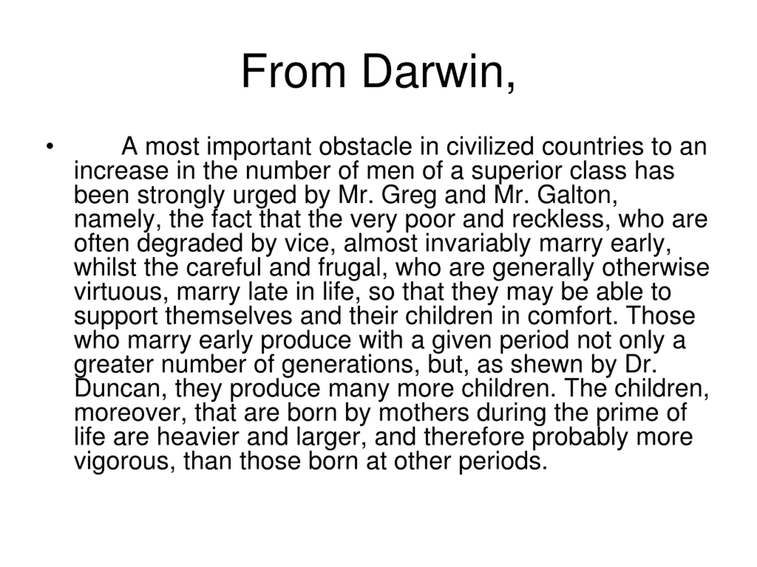 From Darwin, A most important obstacle in civilized countries to an increase in the number of men of a superior class has been strongly urged by Mr. Greg and Mr. Galton, namely, the fact that the very poor and reckless, who are often degraded by vice, almost invariably marry early, whilst the careful and frugal, who are generally otherwise virtuous, marry late in life, so that they may be able to support themselves and their children in comfort. Those who marry early produce with a given period not only a greater number of generations, but, as shewn by Dr. Duncan, they produce many more children. The children, moreover, that are born by mothers during the prime of life are heavier and larger, and therefore probably more vigorous, than those born at other periods.