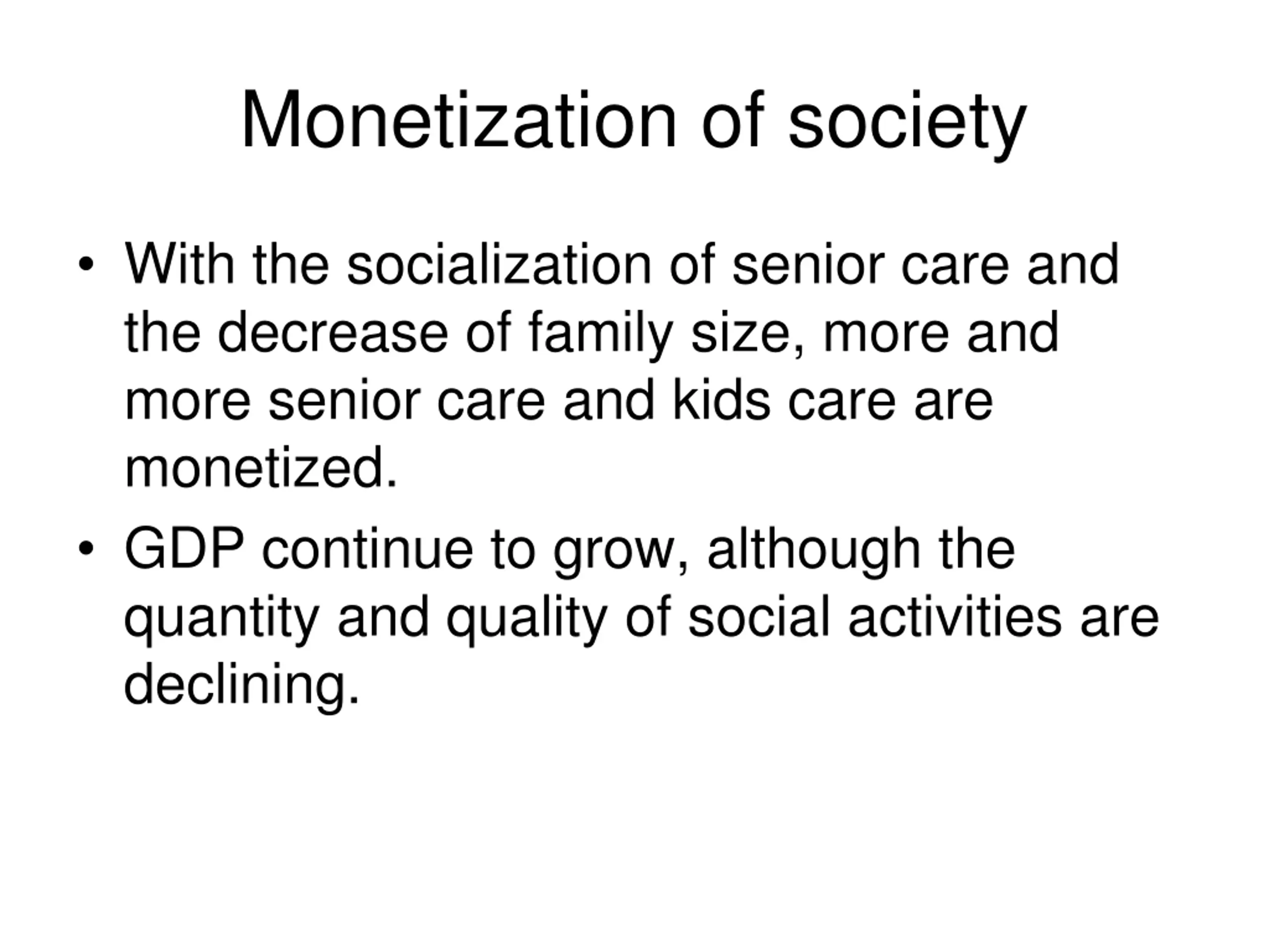 Monetization of society With the socialization of senior care and the decrease of family size, more and more senior care and kids care are monetized. GDP continue to grow, although the quantity and quality of social activities are declining.