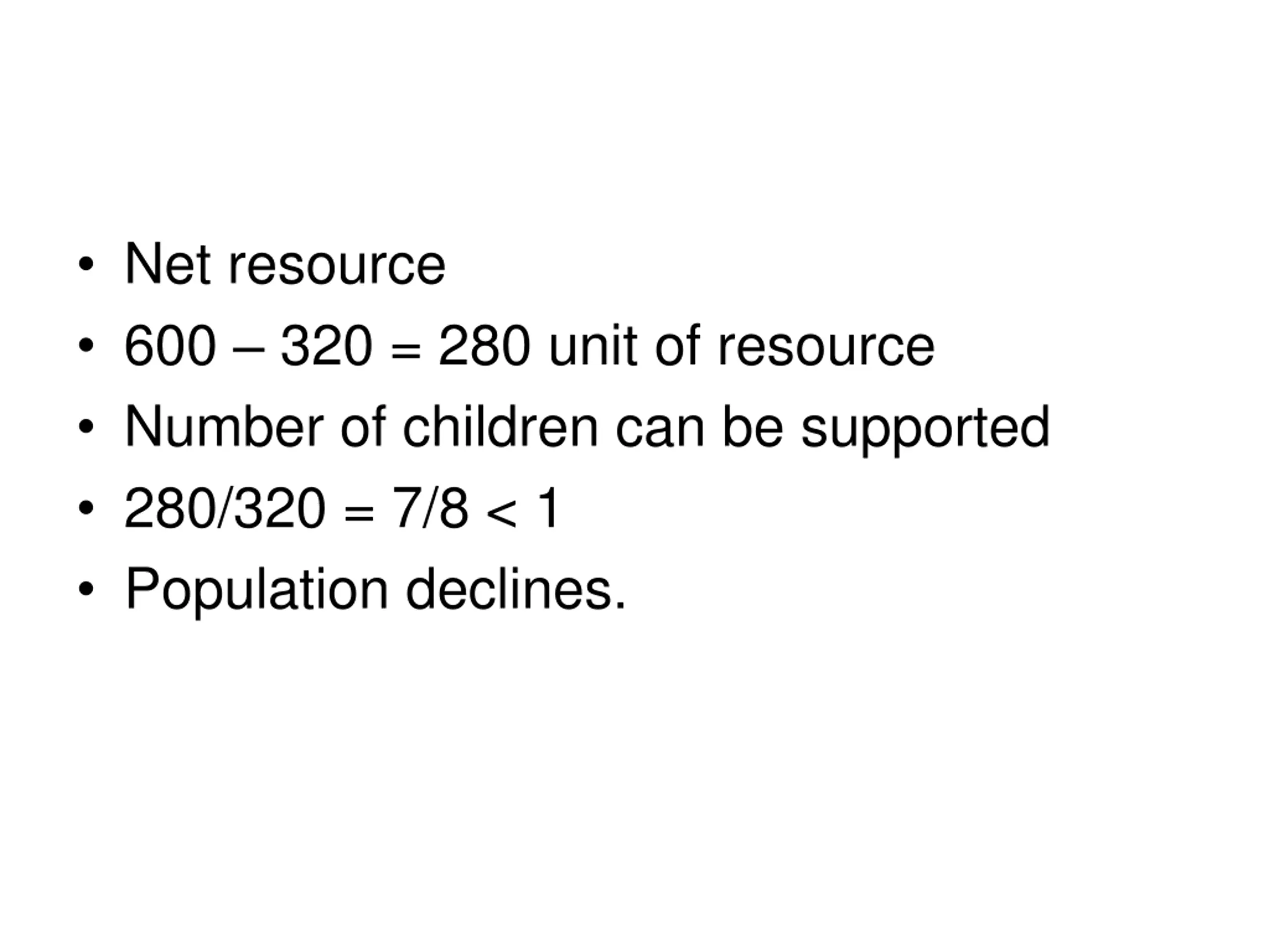 Net resource 600 320 = 280 unit of resource Number of children can be supported 280/320 = 7/8 < 1 Population declines.