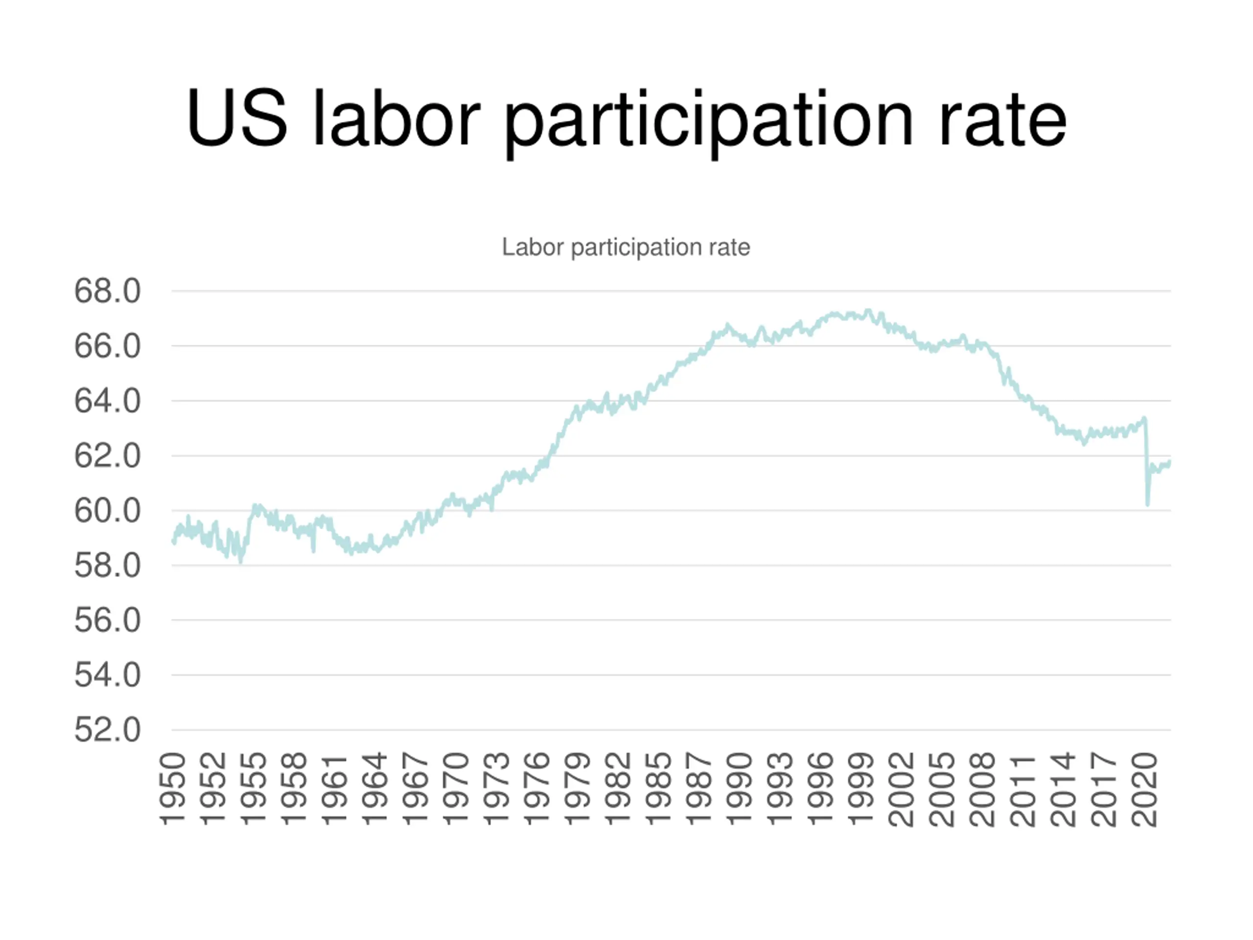 US labor participation rate Labor participation rate 68.0 66.0 64.0 62.0 60.0 58.0 56.0 54.0 52.0 1950 1952 1955 1958 1961 1964 1967 1970 1973 1976 1979 1982 1985 1987 1990 1993 1996 1999 2002 2005 2008 2011 2014 2017 2020