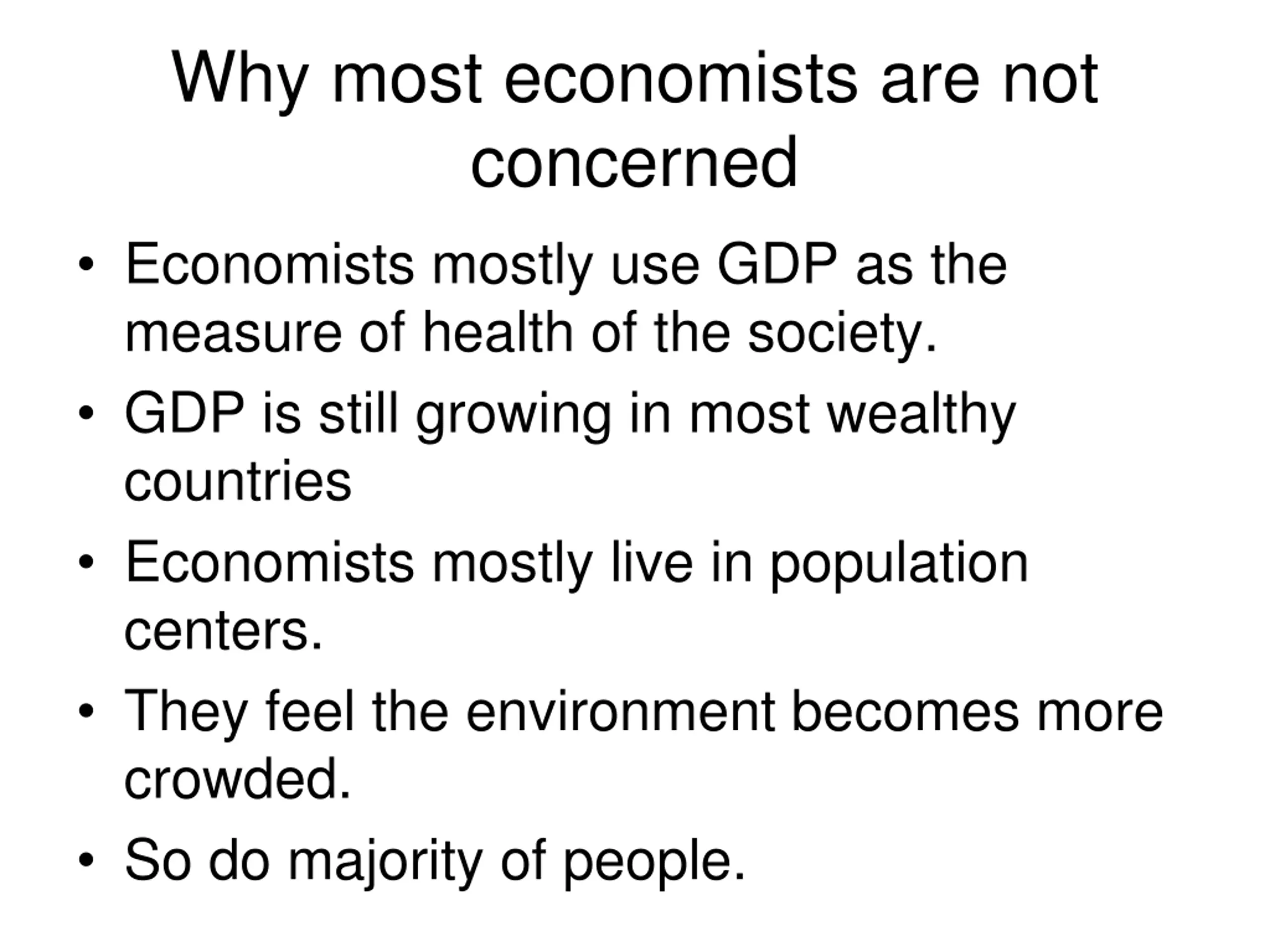 Why most economists are not concerned Economists mostly use GDP as the measure of health of the society. GDP is still growing in most wealthy countries Economists mostly live in population centers. They feel the environment becomes more crowded. So do majority of people.