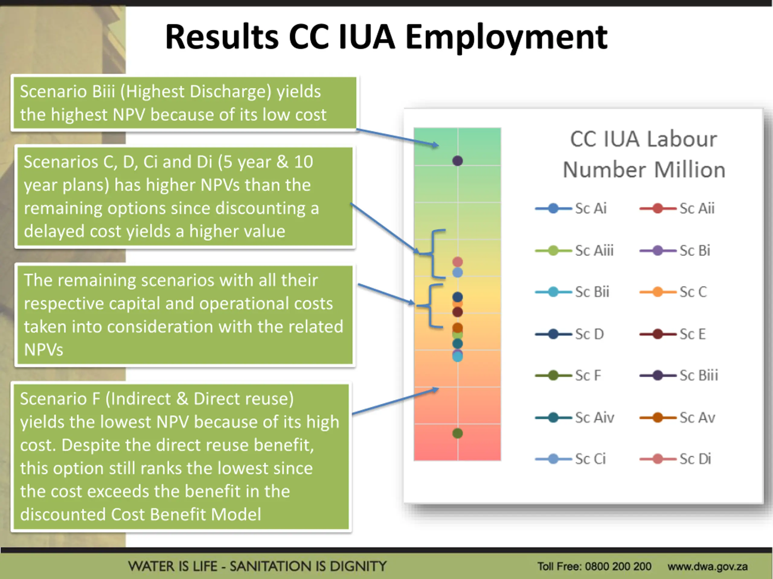 Results CC IUA Employment Scenario Biii (Highest Discharge) yields the highest NPV because of its low cost Scenarios C, D, Ci and Di (5 year & 10 year plans) has higher NPVs than the remaining options since discounting a delayed cost yields a higher value The remaining scenarios with all their respective capital and operational costs taken into consideration with the related NPVs Scenario F (Indirect & Direct reuse) yields the lowest NPV because of its high cost. Despite the direct reuse benefit, this option still ranks the lowest since the cost exceeds the benefit in the discounted Cost Benefit Model
