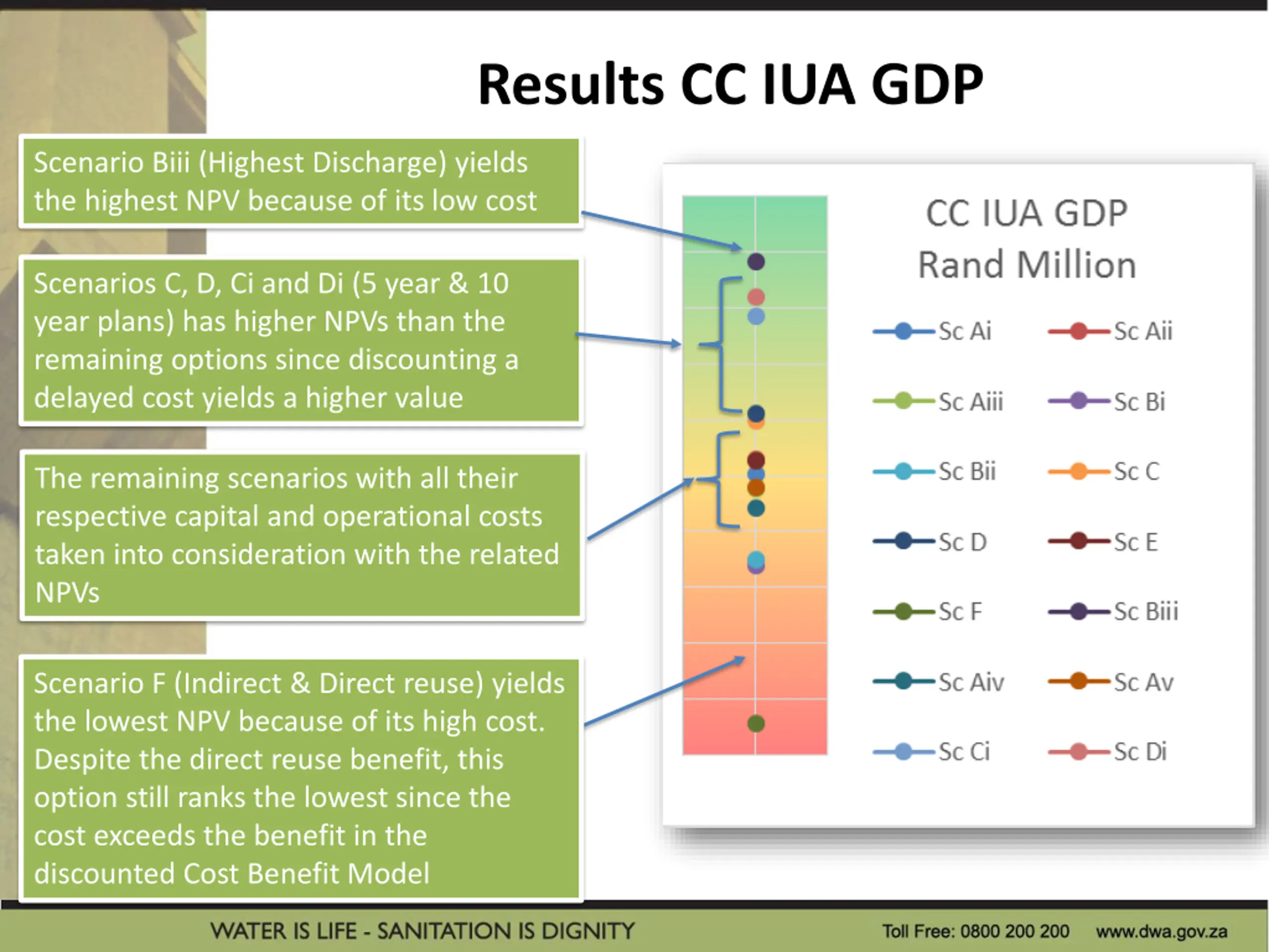 Results CC IUA GDP Scenario Biii (Highest Discharge) yields the highest NPV because of its low cost Scenarios C, D, Ci and Di (5 year & 10 year plans) has higher NPVs than the remaining options since discounting a delayed cost yields a higher value The remaining scenarios with all their respective capital and operational costs taken into consideration with the related NPVs Scenario F (Indirect & Direct reuse) yields the lowest NPV because of its high cost. Despite the direct reuse benefit, this option still ranks the lowest since the cost exceeds the benefit in the discounted Cost Benefit Model