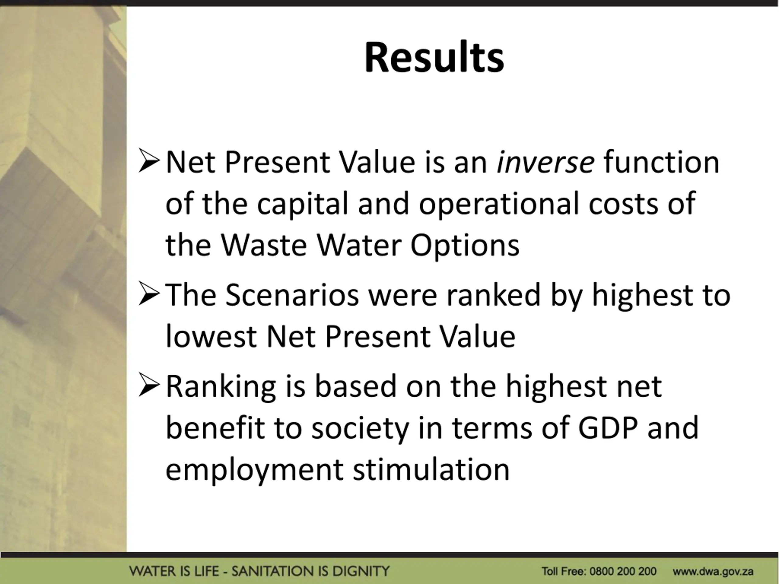 Results Net Present Value is an inverse function of the capital and operational costs of the Waste Water Options The Scenarios were ranked by highest to lowest Net Present Value Ranking is based on the highest net benefit to society in terms of GDP and employment stimulation