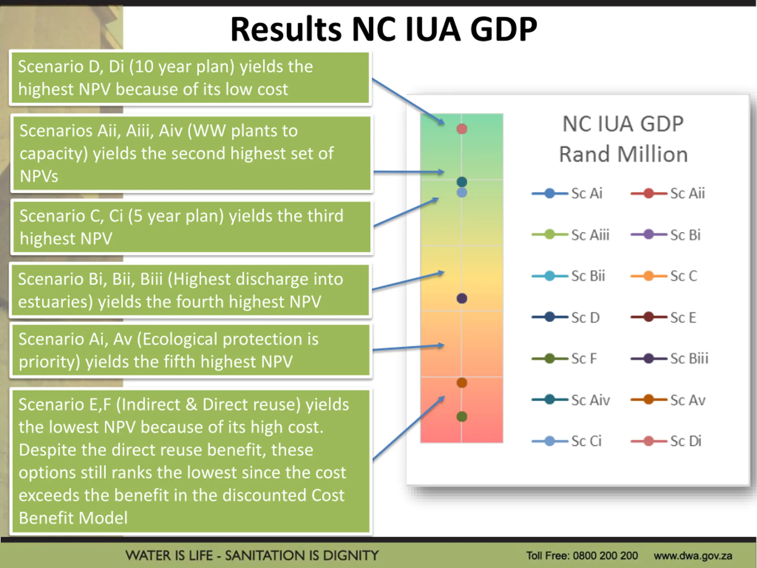 Results SC IUA GDP Scenario Aii, Aiii, Aiv (WW at capacity) yields the highest NPV because of its low cost Scenarios Bi, Bii, Biii (Highest discharge into estuaries) yields the second highest set of NPVs Scenario D, Di (10 year plan) yields the third highest NPV Scenario C, Ci (5 year plan) yields the fourth highest NPV Scenario Ai, Av (Ecological protection is priority) yields the fifth highest NPV Scenario E,F (Indirect & Direct reuse) yields the lowest NPV because of its high cost. Despite the direct reuse benefit, these options still ranks the lowest since the cost exceeds the benefit in the discounted Cost Benefit Model
