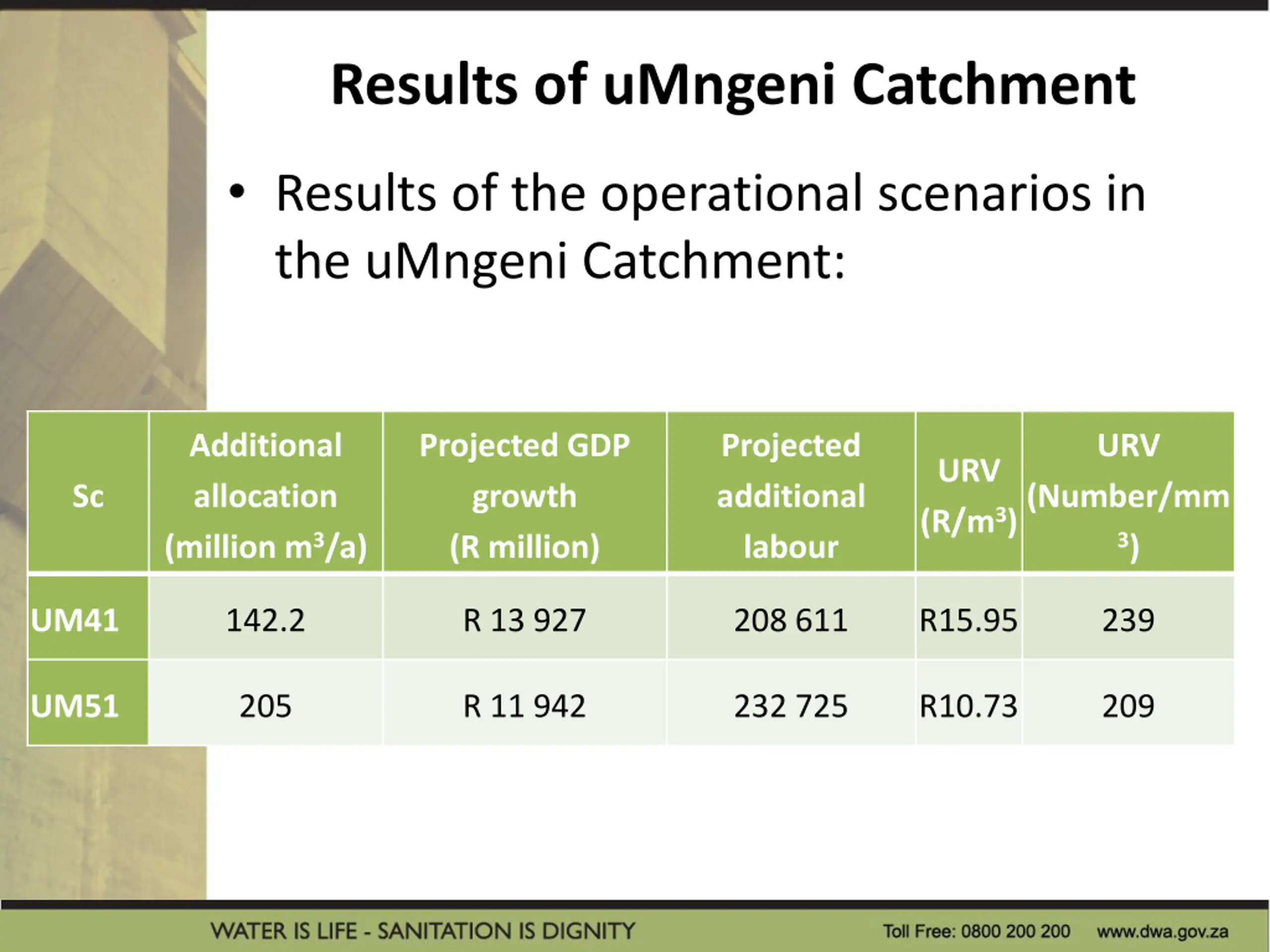 Results of uMngeni Catchment Results of the operational scenarios in the uMngeni Catchment: Additional allocation (million m3/a) Projected GDP growth (R million) Projected additional labour URV URV (R/m3) Sc (Number/mm 3) UM41 142.2 R 13 927 208 611 R15.95 239 UM51 205 R 11 942 232 725 R10.73 209