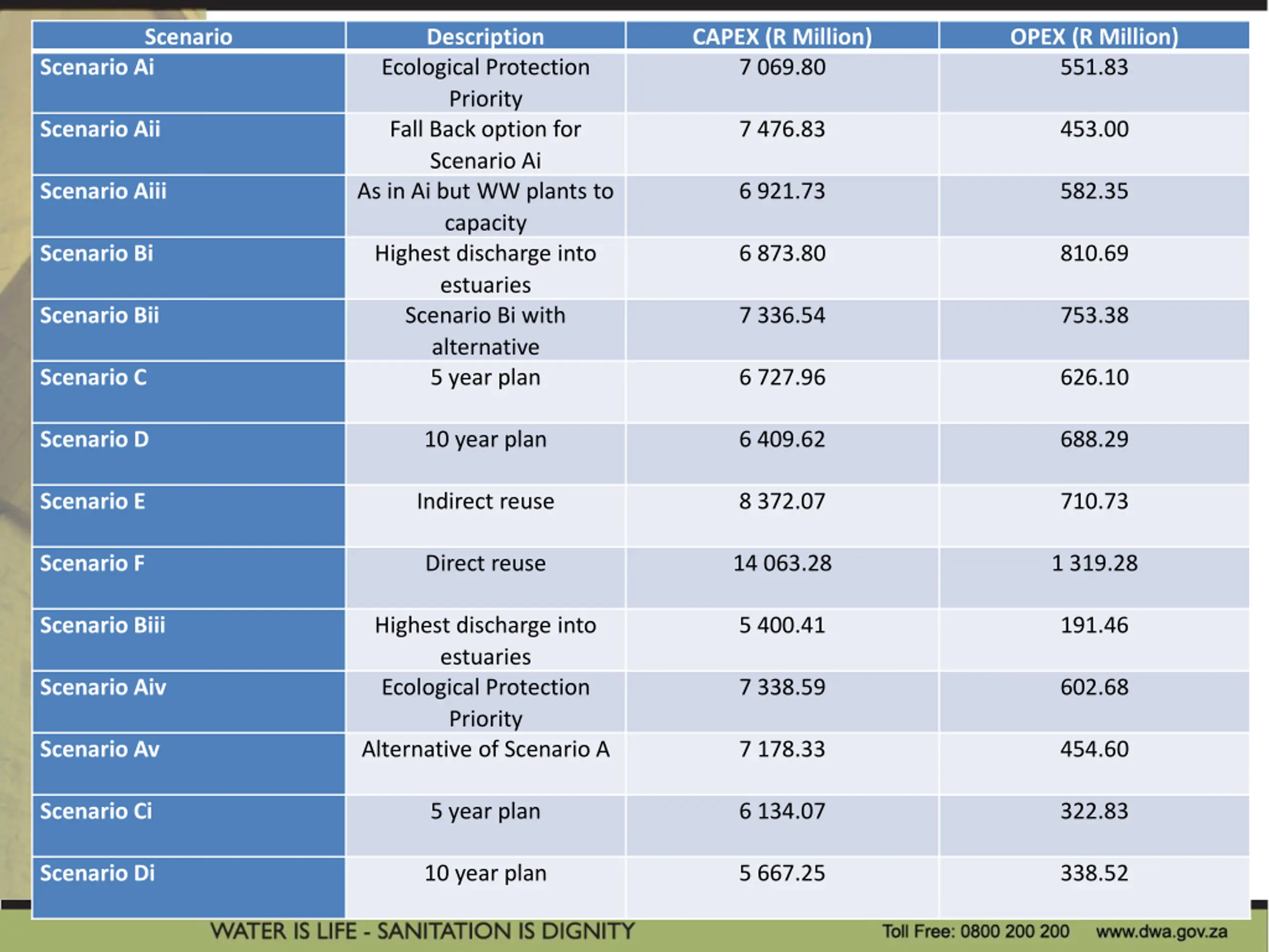 Scenario Description Ecological Protection Priority Fall Back option for Scenario Ai As in Ai but WW plants to capacity Highest discharge into estuaries Scenario Bi with alternative 5 year plan CAPEX (R Million) 7 069.80 OPEX (R Million) 551.83 Scenario Ai Scenario Aii 7 476.83 453.00 Scenario Aiii 6 921.73 582.35 Scenario Bi 6 873.80 810.69 Scenario Bii 7 336.54 753.38 Scenario C 6 727.96 626.10 Scenario D 10 year plan 6 409.62 688.29 Scenario E Indirect reuse 8 372.07 710.73 Scenario F Direct reuse 14 063.28 1 319.28 Scenario Biii Highest discharge into estuaries Ecological Protection Priority Alternative of Scenario A 5 400.41 191.46 Scenario Aiv 7 338.59 602.68 Scenario Av 7 178.33 454.60 Scenario Ci 5 year plan 6 134.07 322.83 Scenario Di 10 year plan 5 667.25 338.52