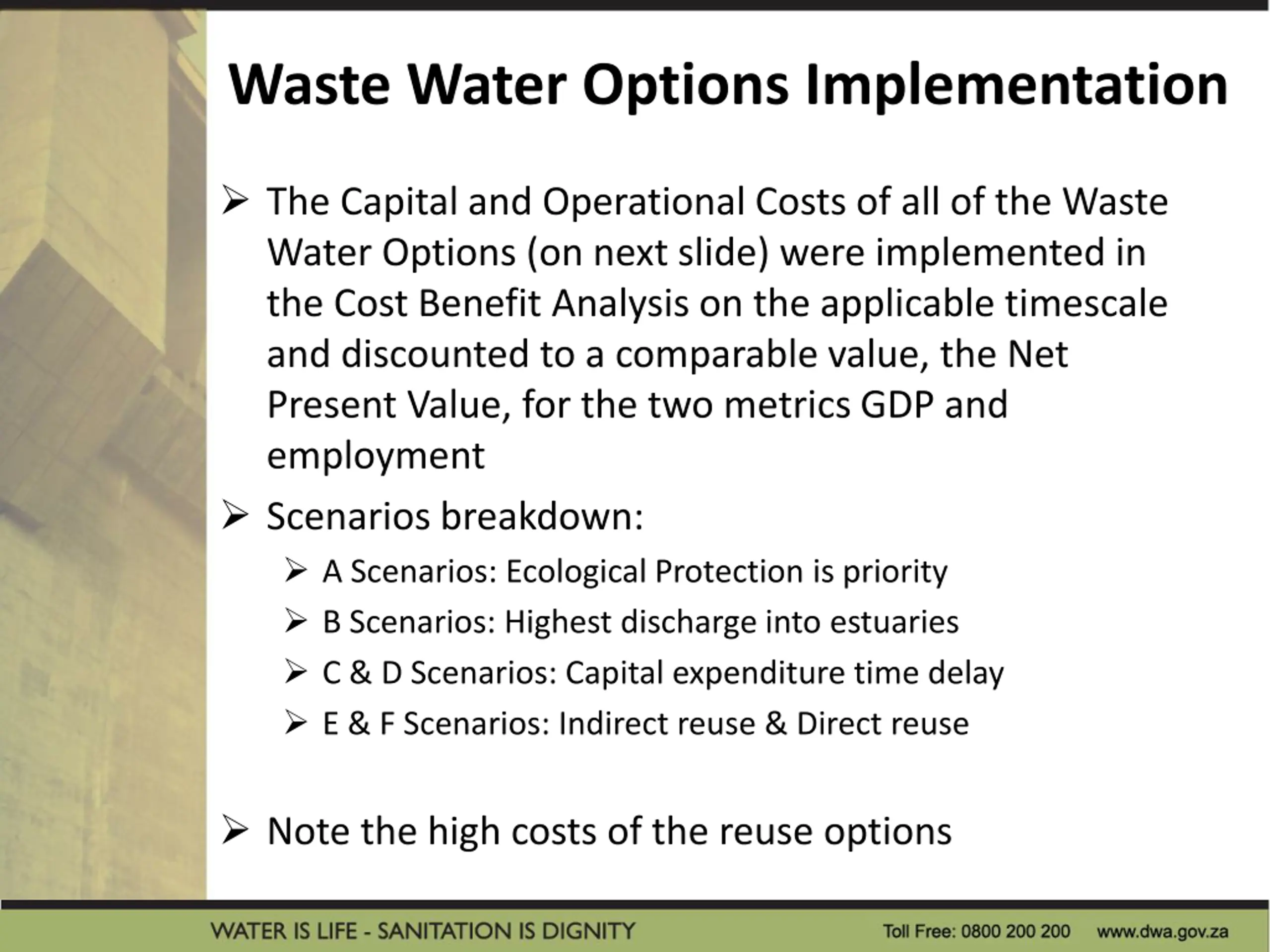 Waste Water Options Implementation The Capital and Operational Costs of all of the Waste Water Options (on next slide) were implemented in the Cost Benefit Analysis on the applicable timescale and discounted to a comparable value, the Net Present Value, for the two metrics GDP and employment Scenarios breakdown: A Scenarios: Ecological Protection is priority B Scenarios: Highest discharge into estuaries C & D Scenarios: Capital expenditure time delay E & F Scenarios: Indirect reuse & Direct reuse Note the high costs of the reuse options