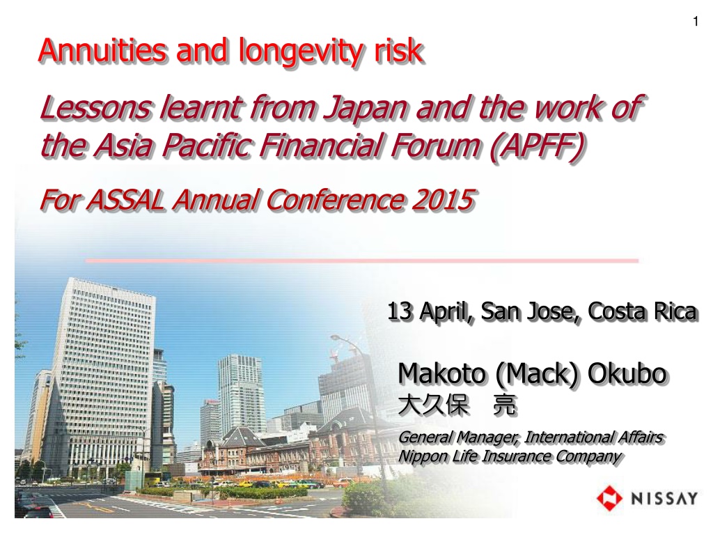 1 Annuities and longevity risk Lessons learnt from Japan and the work of the Asia Pacific Financial Forum (APFF) For ASSAL Annual Conference 2015 13 April, San Jose, Costa Rica Makoto (Mack) Okubo General Manager, International Affairs Nippon Life Insurance Company