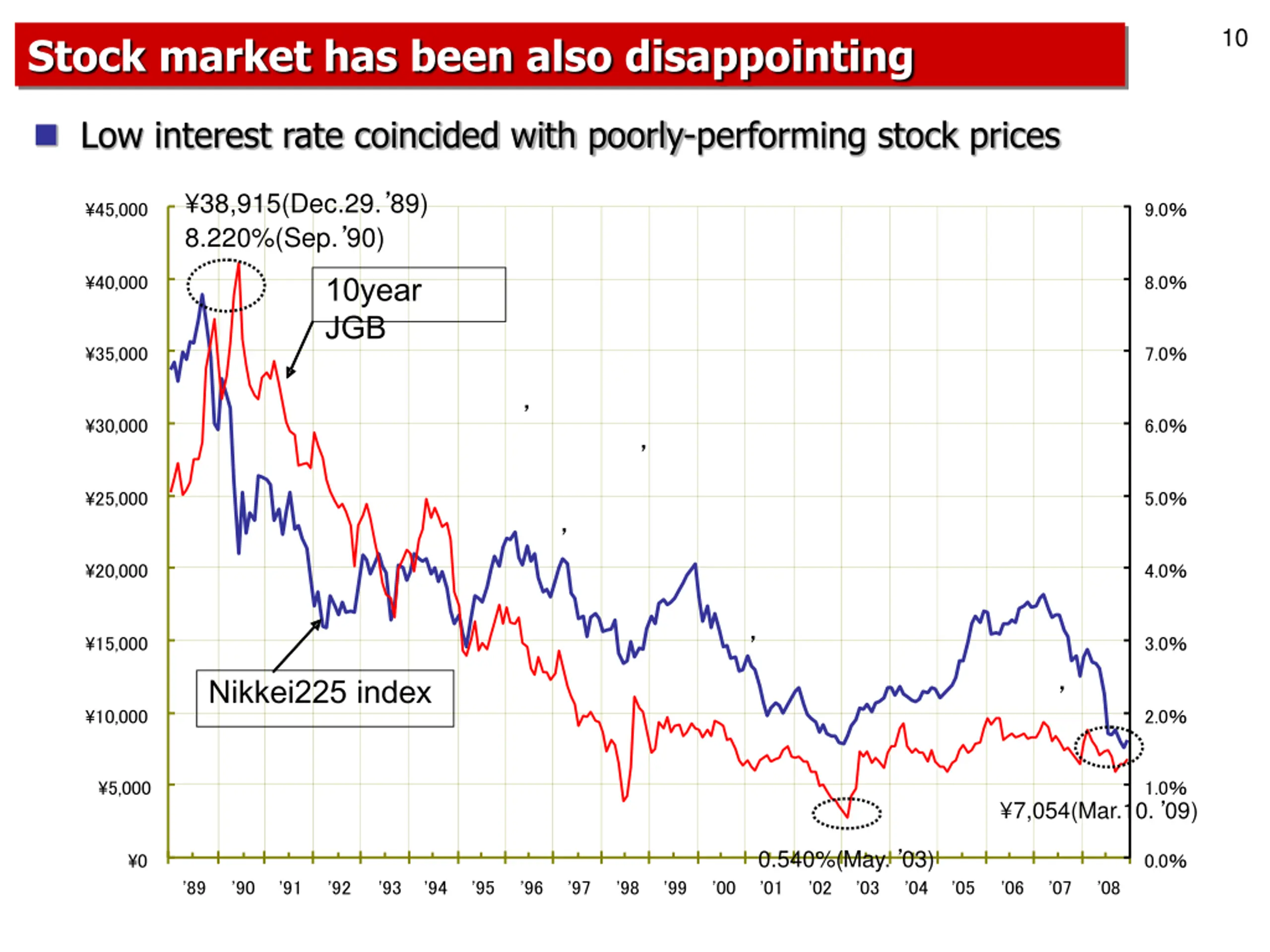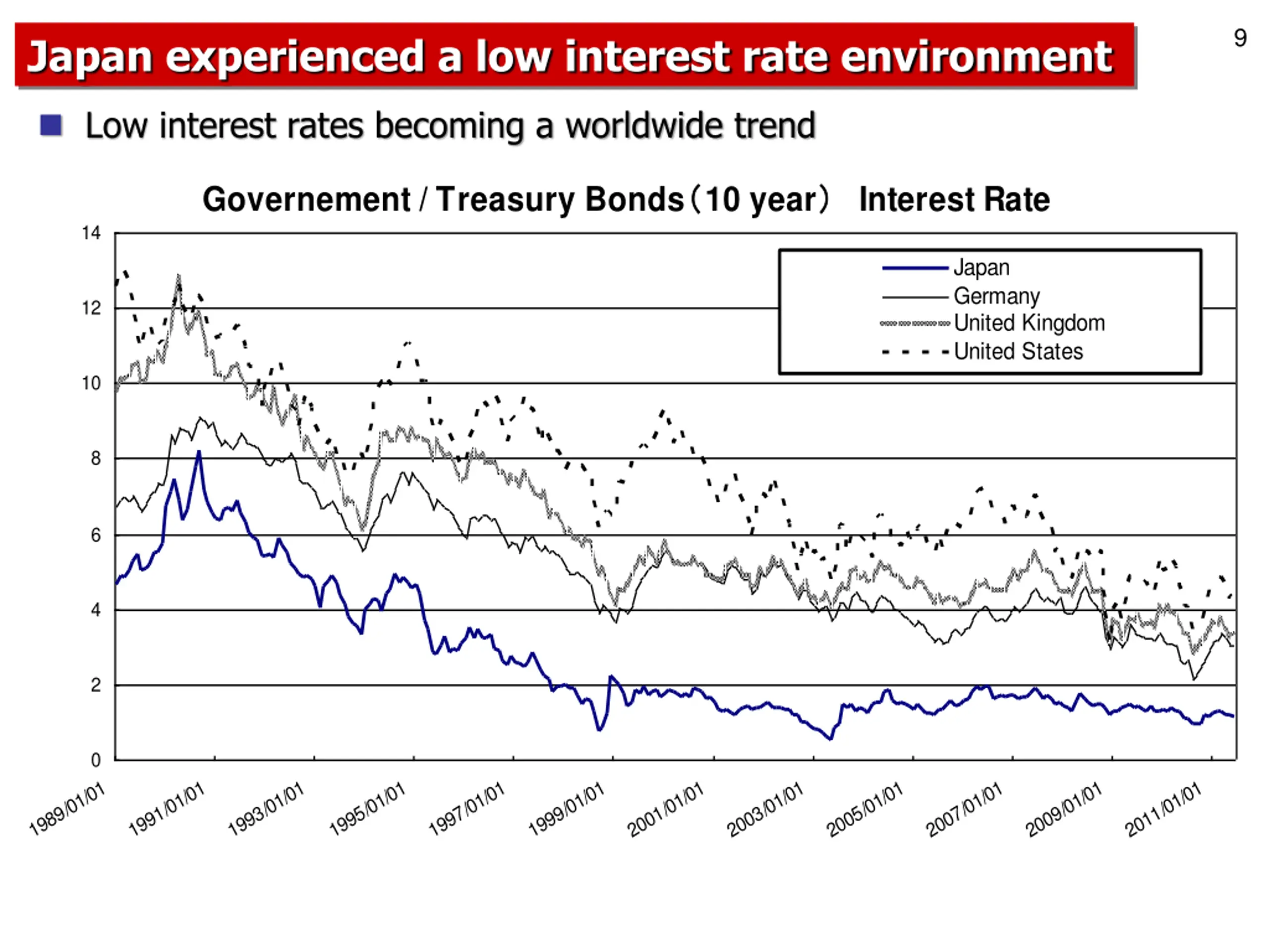 9 Japan experienced a low interest rate environment Low interest rates becoming a worldwide trend Governement / Treasury Bonds 10 year Interest Rate 14 Japan Germany United Kingdom United States 12 10 8 6 4 2 0 1989/01/01 1991/01/01 1993/01/01 1995/01/01 1997/01/01 1999/01/01 2001/01/01 2003/01/01 2005/01/01 2007/01/01 2009/01/01 2011/01/01
