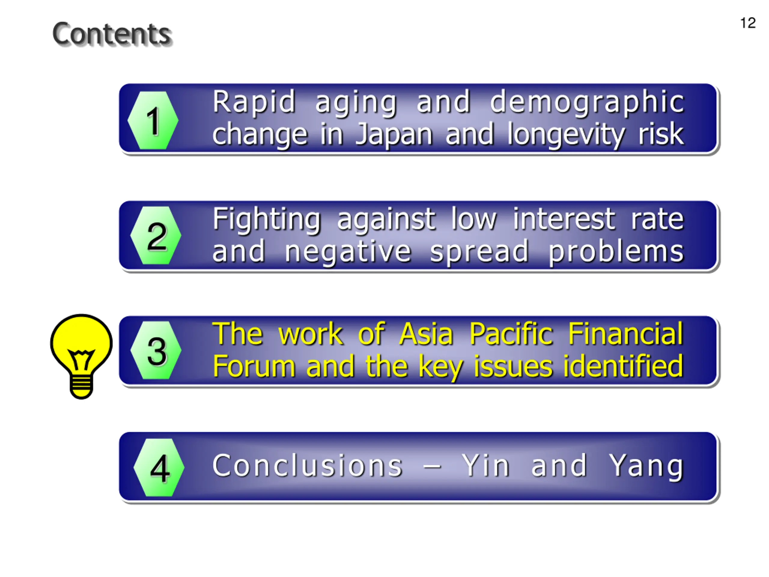 2 Contents Rapid aging and demographic change in Japan and longevity risk 1 Fighting against low interest rate and negative spread problems 2 The work of Asia Pacific Financial Forum and the key issues identified 3 4 Conclusions Yin and Yang