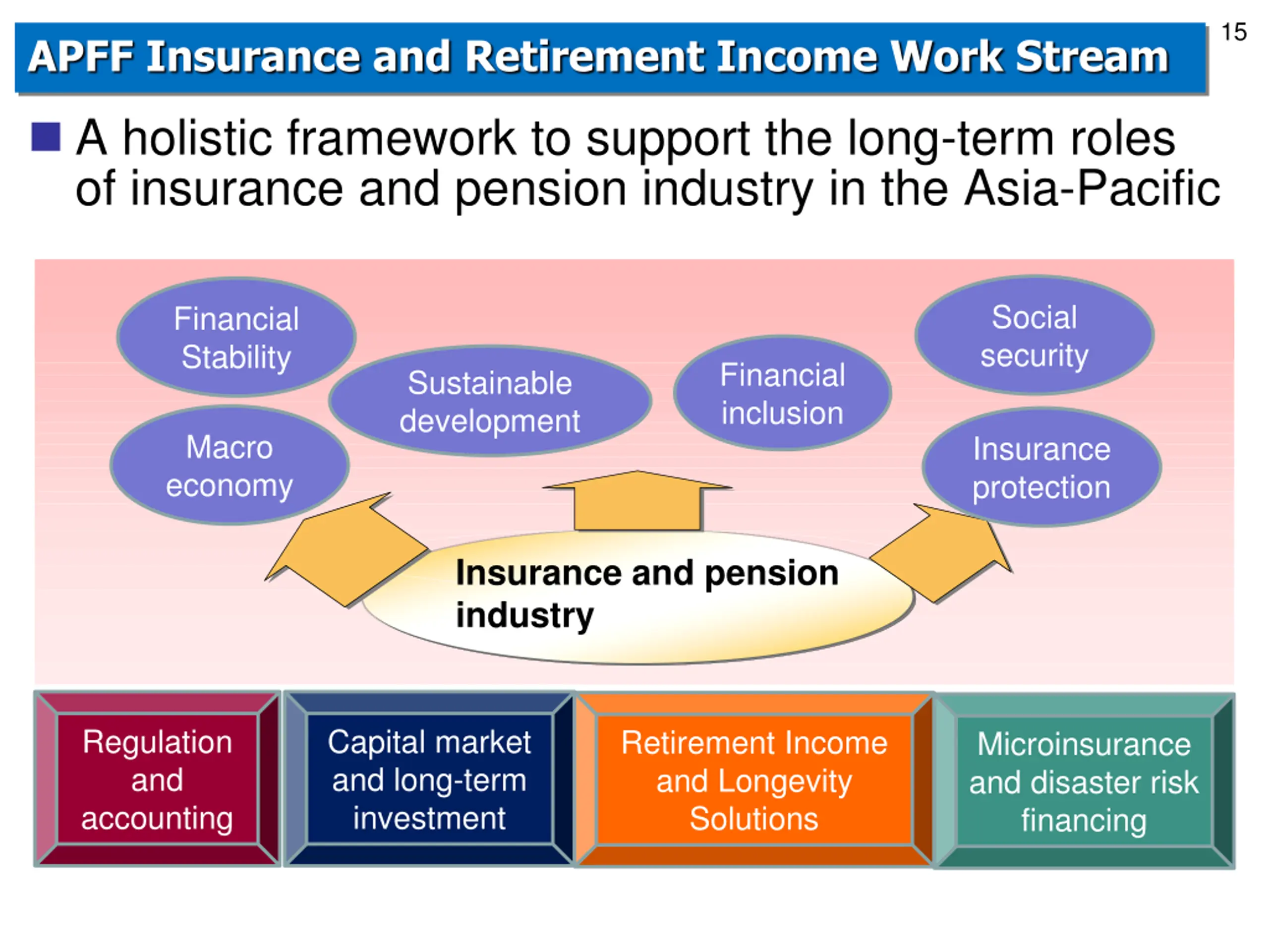 15 APFF Insurance and Retirement Income Work Stream A holistic framework to support the long-term roles of insurance and pension industry in the Asia-Pacific Social security Financial Stability Financial inclusion Sustainable development Macro economy Insurance protection Insurance and pension Insurance industry industry Regulation and accounting Capital market and long-term investment Retirement Income and Longevity Solutions Microinsurance and disaster risk financing