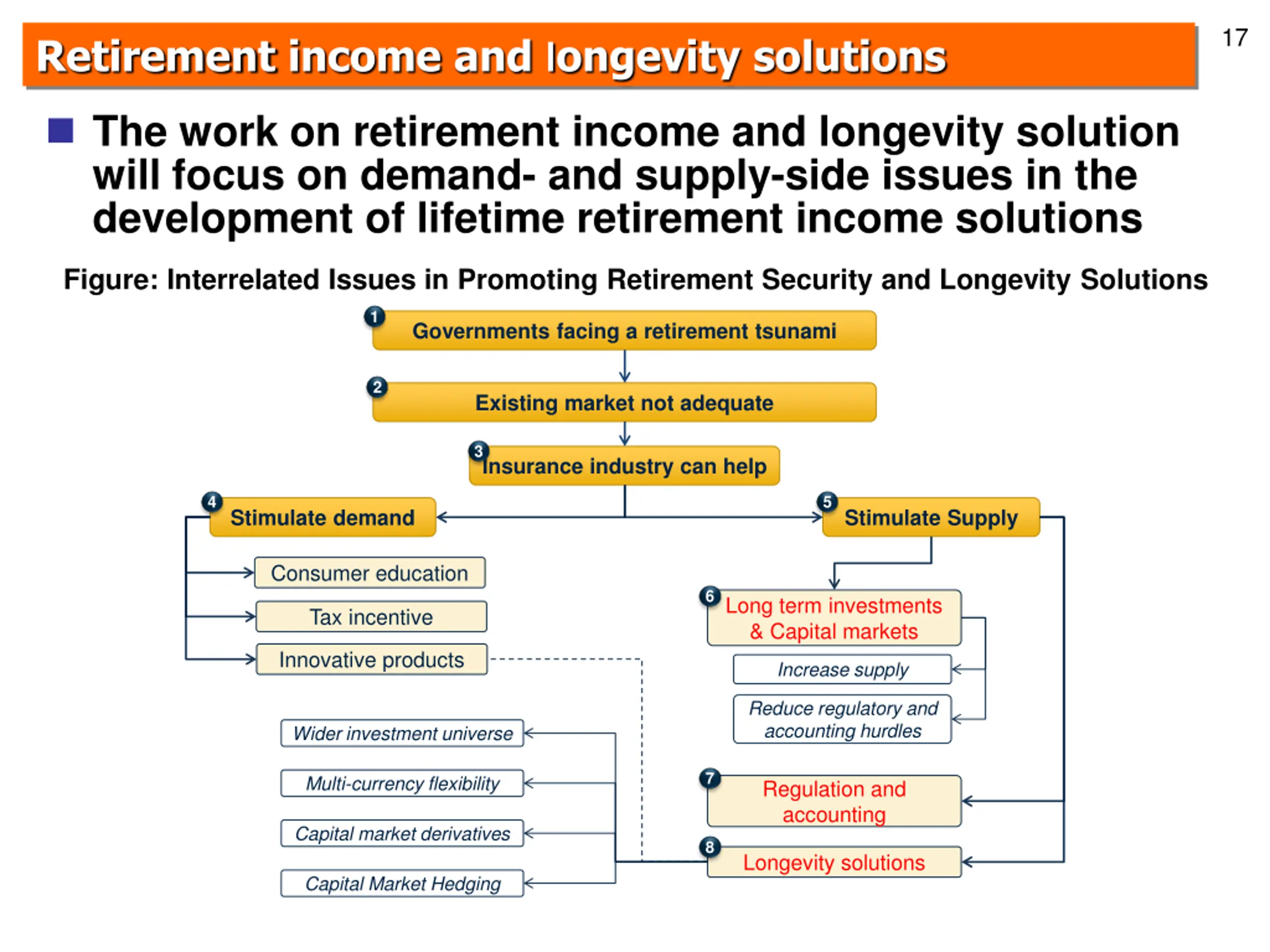 17 Retirement income and ongevity solutions The work on retirement income and longevity solution will focus on demand- and supply-side issues in the development of lifetime retirement income solutions Figure: Interrelated Issues in Promoting Retirement Security and Longevity Solutions 1 Governments facing a retirement tsunami 2 Existing market not adequate 3 Insurance industry can help 4 5 Stimulate demand Stimulate Supply Consumer education 6 Long term investments & Capital markets Tax incentive Innovative products Increase supply Reduce regulatory and accounting hurdles Wider investment universe 7 Multi-currency flexibility Regulation and accounting Capital market derivatives 8 Longevity solutions Capital Market Hedging