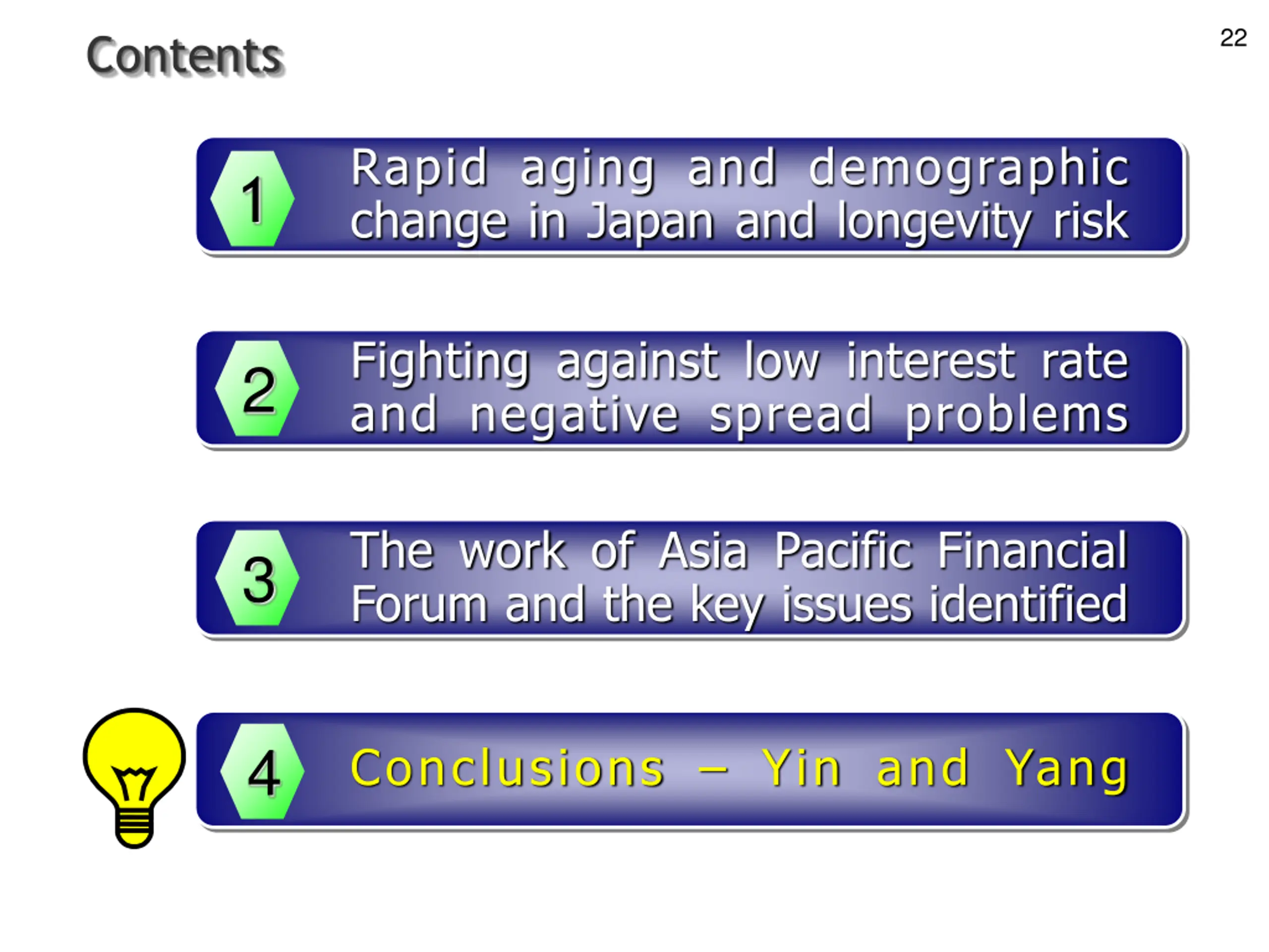 22 Contents Rapid aging and demographic change in Japan and longevity risk 1 Fighting against low interest rate and negative spread problems 2 The work of Asia Pacific Financial Forum and the key issues identified 3 4 Conclusions Yin and Yang
