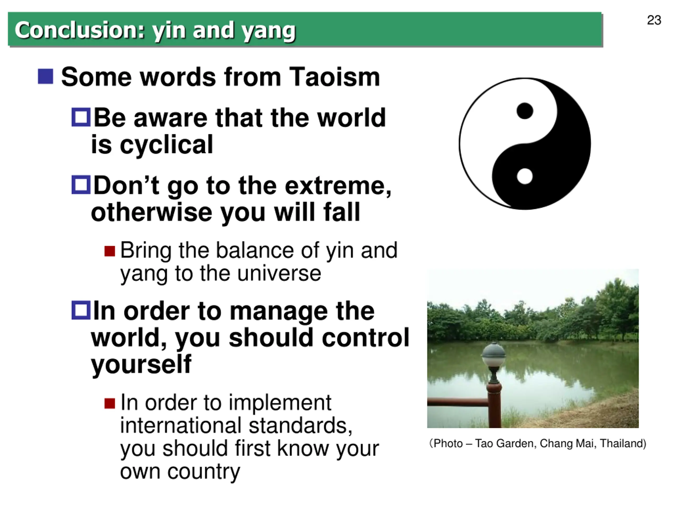 23 Conclusion: yin and yang Some words from Taoism Be aware that the world is cyclical Don t go to the extreme, otherwise you will fall Bring the balance of yin and yang to the universe In order to manage the world, you should control yourself In order to implement international standards, you should first know your own country Photo Tao Garden, Chang Mai, Thailand)