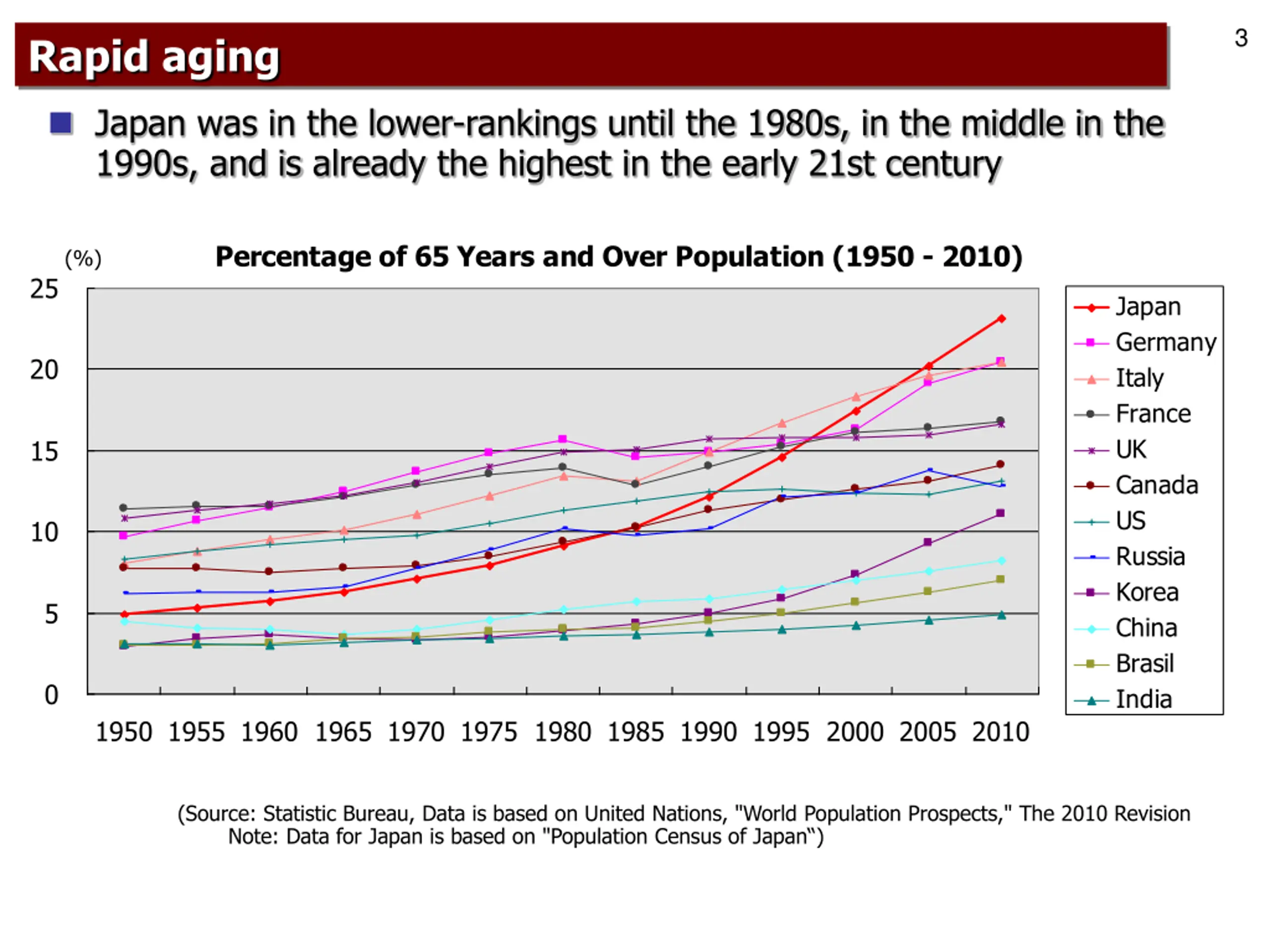 3 Rapid aging Japan was in the lower-rankings until the 1980s, in the middle in the 1990s, and is already the highest in the early 21st century Percentage of 65 Years and Over Population (1950 - 2010) (%) 25 Japan Germany Italy France UK Canada US Russia Korea China Brasil India 20 15 10 5 0 1950 1955 1960 1965 1970 1975 1980 1985 1990 1995 2000 2005 2010 (Source: Statistic Bureau, Data is based on United Nations, "World Population Prospects," The 2010 Revision Note: Data for Japan is based on "Population Census of Japan )