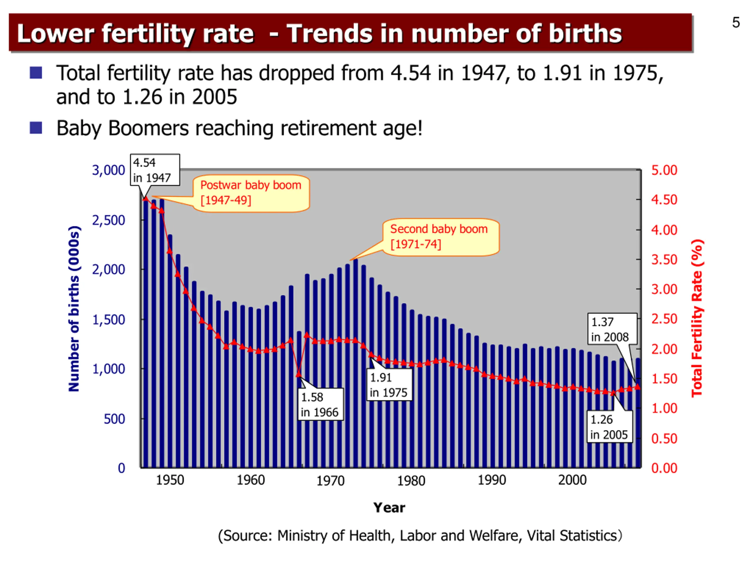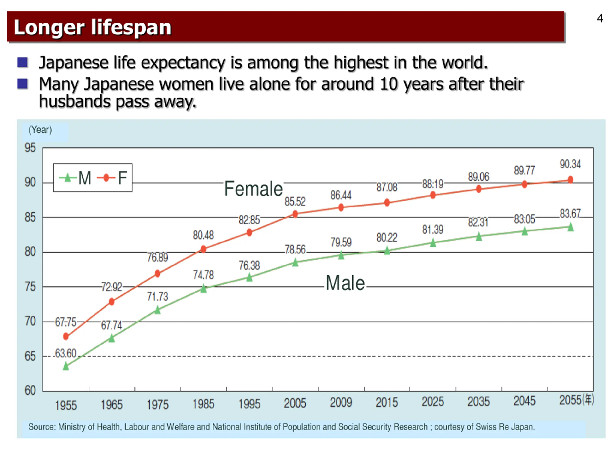 4 Longer lifespan Japanese life expectancy is among the highest in the world. Many Japanese women live alone for around 10 years after their husbands pass away. (Year) M F Female Female Male Male Source: Ministry of Health, Labour and Welfare and National Institute of Population and Social Security Research ; courtesy of Swiss Re Japan.