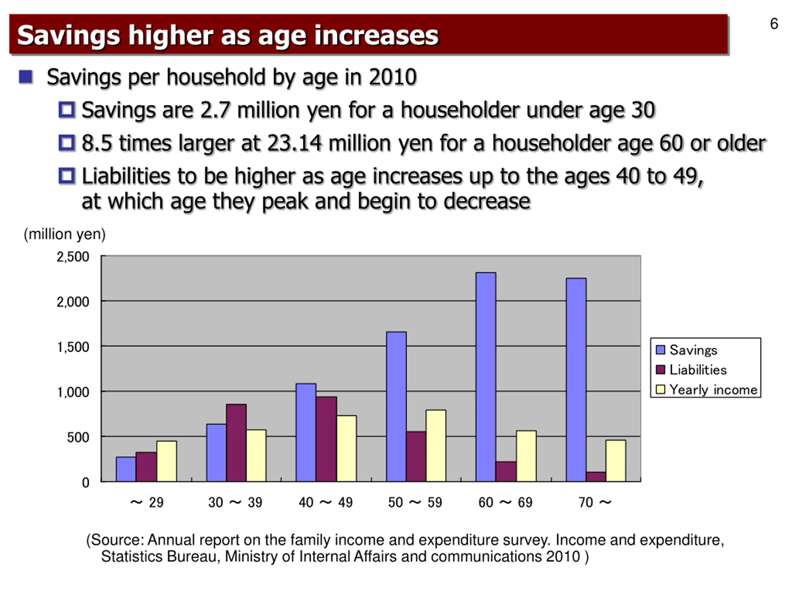 6 Savings higher as age increases Savings per household by age in 2010 Savings are 2.7 million yen for a householder under age 30 8.5 times larger at 23.14 million yen for a householder age 60 or older Liabilities to be higher as age increases up to the ages 40 to 49, at which age they peak and begin to decrease (million yen) 2,500 2,000 1,500 Savings Liabilities Yearly income 1,000 500 0 29 30 39 40 49 50 59 60 69 70 (Source: Annual report on the family income and expenditure survey. Income and expenditure, Statistics Bureau, Ministry of Internal Affairs and communications 2010 )