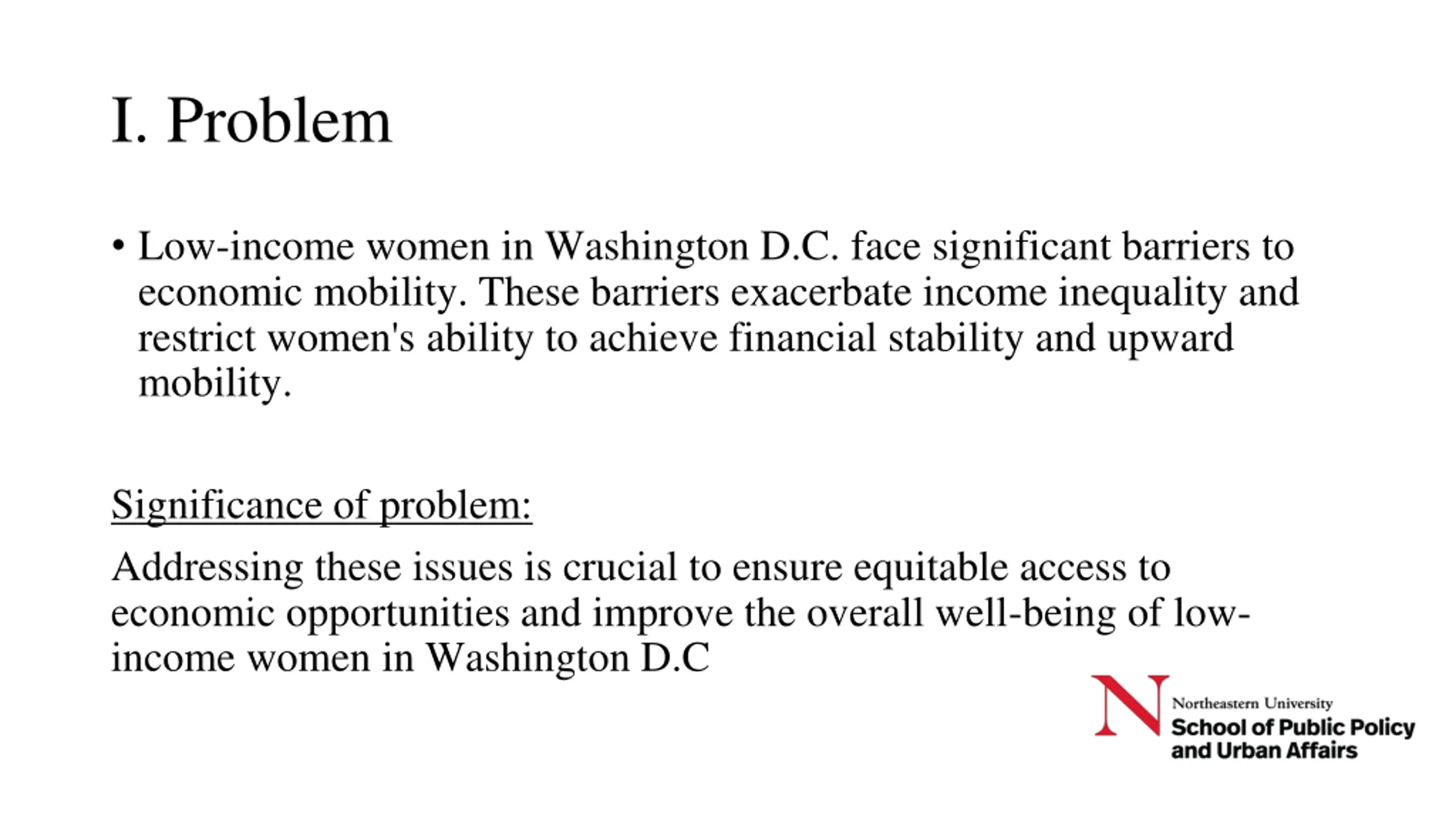I. Problem Low-income women in Washington D.C. face significant barriers to economic mobility. These barriers exacerbate income inequality and restrict women's ability to achieve financial stability and upward mobility. Significance of problem: Addressing these issues is crucial to ensure equitable access to economic opportunities and improve the overall well-being of low- income women in Washington D.C