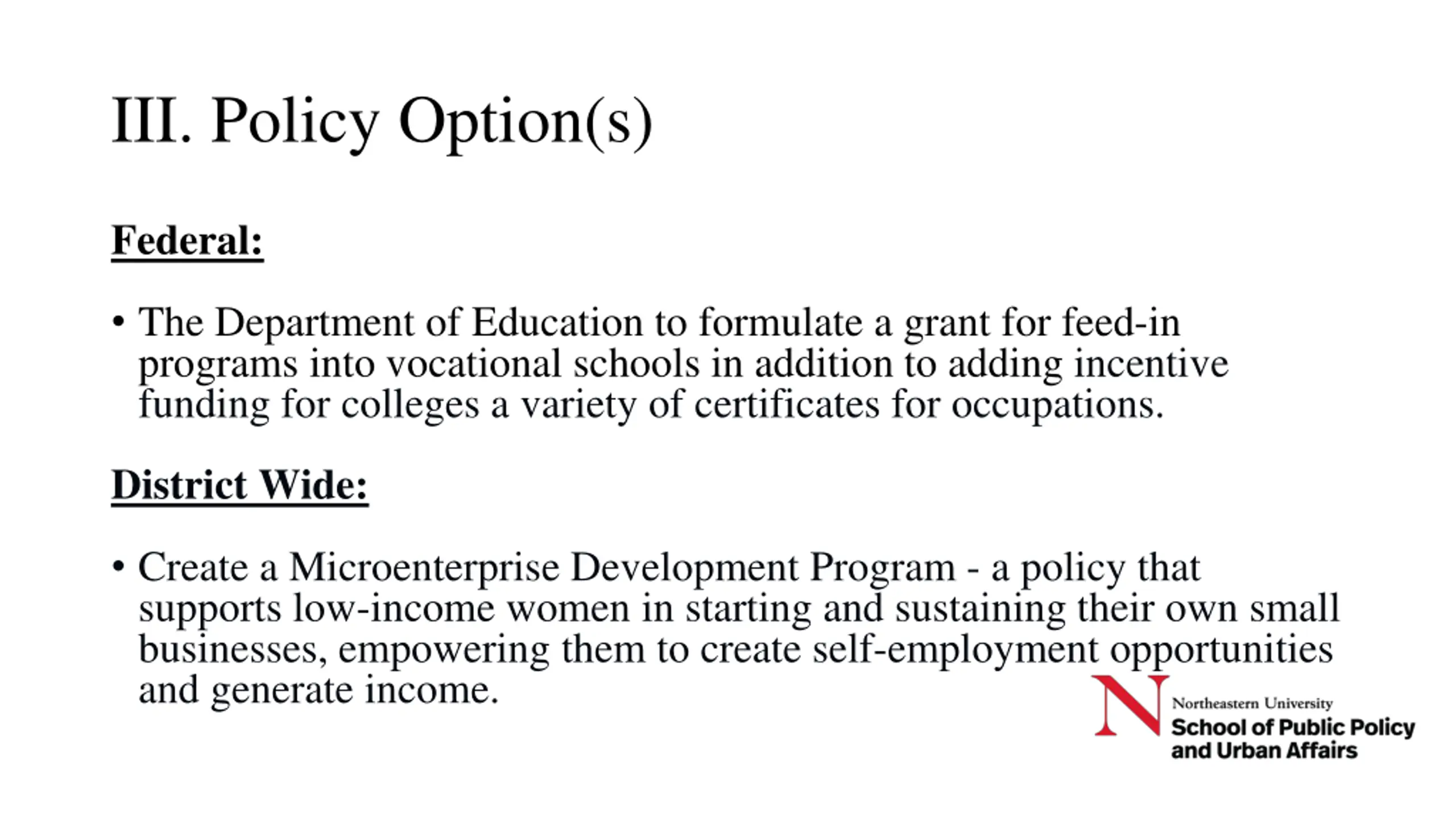 III. Policy Option(s) Federal: The Department of Education to formulate a grant for feed-in programs into vocational schools in addition to adding incentive funding for colleges a variety of certificates for occupations. District Wide: Create a Microenterprise Development Program - a policy that supports low-income women in starting and sustaining their own small businesses, empowering them to create self-employment opportunities and generate income.