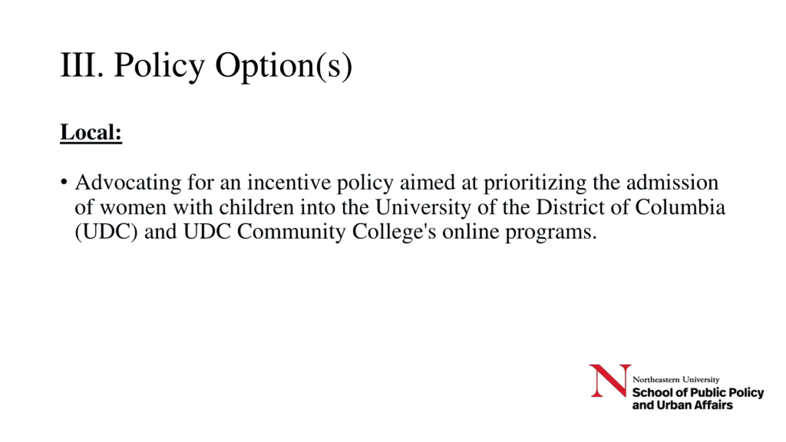 III. Policy Option(s) Local: Advocating for an incentive policy aimed at prioritizing the admission of women with children into the University of the District of Columbia (UDC) and UDC Community College's online programs.