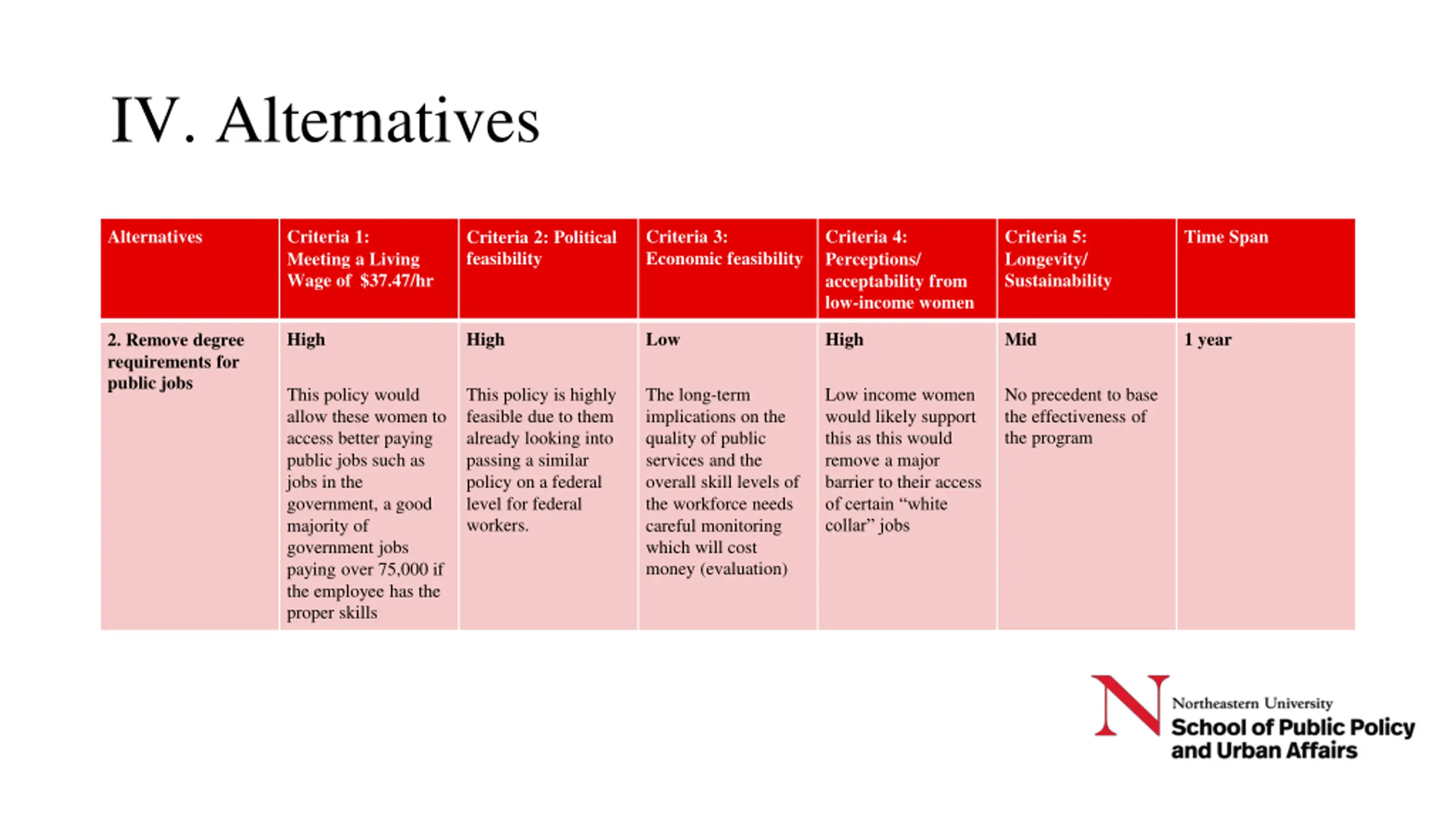 IV. Alternatives Alternatives Criteria 1: Meeting a Living Wage of $37.47/hr Criteria 3: Economic feasibility Criteria 4: Perceptions/ acceptability from low-income women Criteria 5: Longevity/ Sustainability Time Span Criteria 2: Political feasibility High High Low High Mid 1 year 2. Remove degree requirements for public jobs This policy would allow these women to access better paying public jobs such as jobs in the government, a good majority of government jobs paying over 75,000 if the employee has the proper skills This policy is highly feasible due to them already looking into passing a similar policy on a federal level for federal workers. The long-term implications on the quality of public services and the overall skill levels of the workforce needs careful monitoring which will cost money (evaluation) Low income women would likely support this as this would remove a major barrier to their access of certain white collar jobs No precedent to base the effectiveness of the program