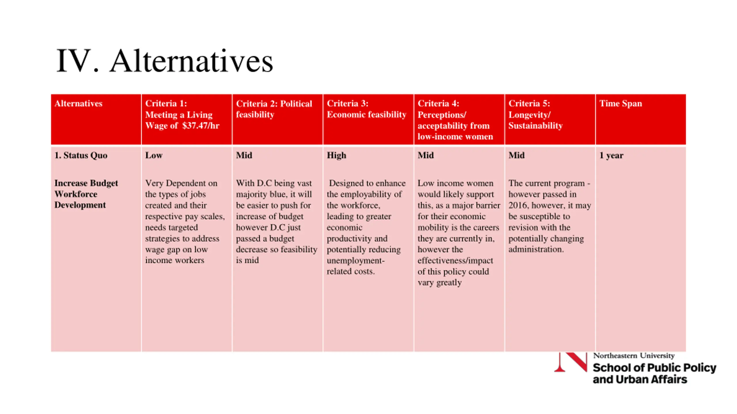 IV. Alternatives Alternatives Criteria 1: Meeting a Living Wage of $37.47/hr Criteria 3: Economic feasibility Criteria 4: Perceptions/ acceptability from low-income women Criteria 5: Longevity/ Sustainability Time Span Criteria 2: Political feasibility 1. Status Quo Low Mid High Mid Mid 1 year Increase Budget Workforce Development Very Dependent on the types of jobs created and their respective pay scales, needs targeted strategies to address wage gap on low income workers With D.C being vast majority blue, it will be easier to push for increase of budget however D.C just passed a budget decrease so feasibility is mid Designed to enhance the employability of the workforce, leading to greater economic productivity and potentially reducing unemployment- related costs. Low income women would likely support this, as a major barrier for their economic mobility is the careers they are currently in, however the effectiveness/impact of this policy could vary greatly The current program - however passed in 2016, however, it may be susceptible to revision with the potentially changing administration.