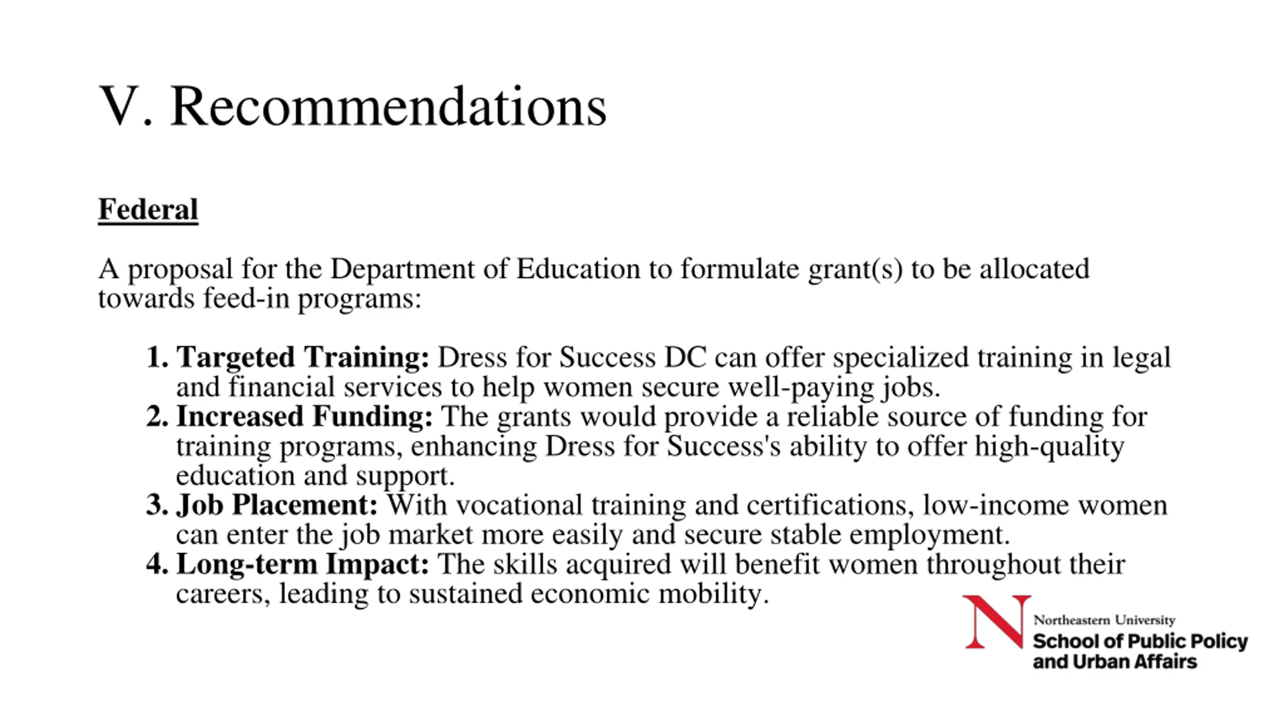V. Recommendations Federal A proposal for the Department of Education to formulate grant(s) to be allocated towards feed-in programs: 1. Targeted Training: Dress for Success DC can offer specialized training in legal and financial services to help women secure well-paying jobs. 2. Increased Funding: The grants would provide a reliable source of funding for training programs, enhancing Dress for Success's ability to offer high-quality education and support. 3. Job Placement: With vocational training and certifications, low-income women can enter the job market more easily and secure stable employment. 4. Long-term Impact: The skills acquired will benefit women throughout their careers, leading to sustained economic mobility.