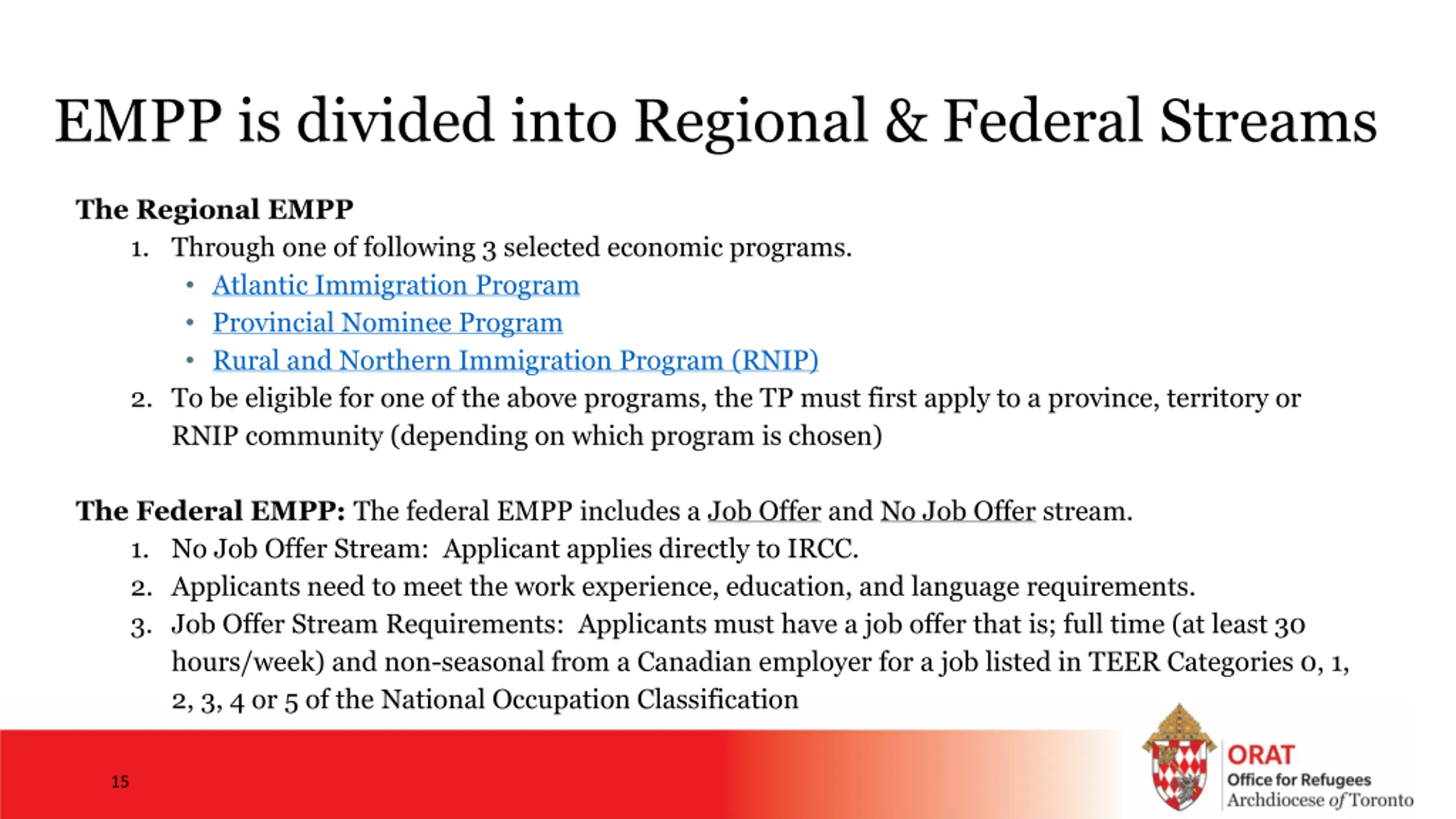 EMPP is divided into Regional & Federal Streams The Regional EMPP 1. Through one of following 3 selected economic programs. Atlantic Immigration Program Provincial Nominee Program Rural and Northern Immigration Program (RNIP) 2. To be eligible for one of the above programs, the TP must first apply to a province, territory or RNIP community (depending on which program is chosen) The Federal EMPP: The federal EMPP includes a Job Offer and No Job Offer stream. 1. No Job Offer Stream: Applicant applies directly to IRCC. 2. Applicants need to meet the work experience, education, and language requirements. 3. Job Offer Stream Requirements: Applicants must have a job offer that is; full time (at least 30 hours/week) and non-seasonal from a Canadian employer for a job listed in TEER Categories 0, 1, 2, 3, 4 or 5 of the National Occupation Classification 15