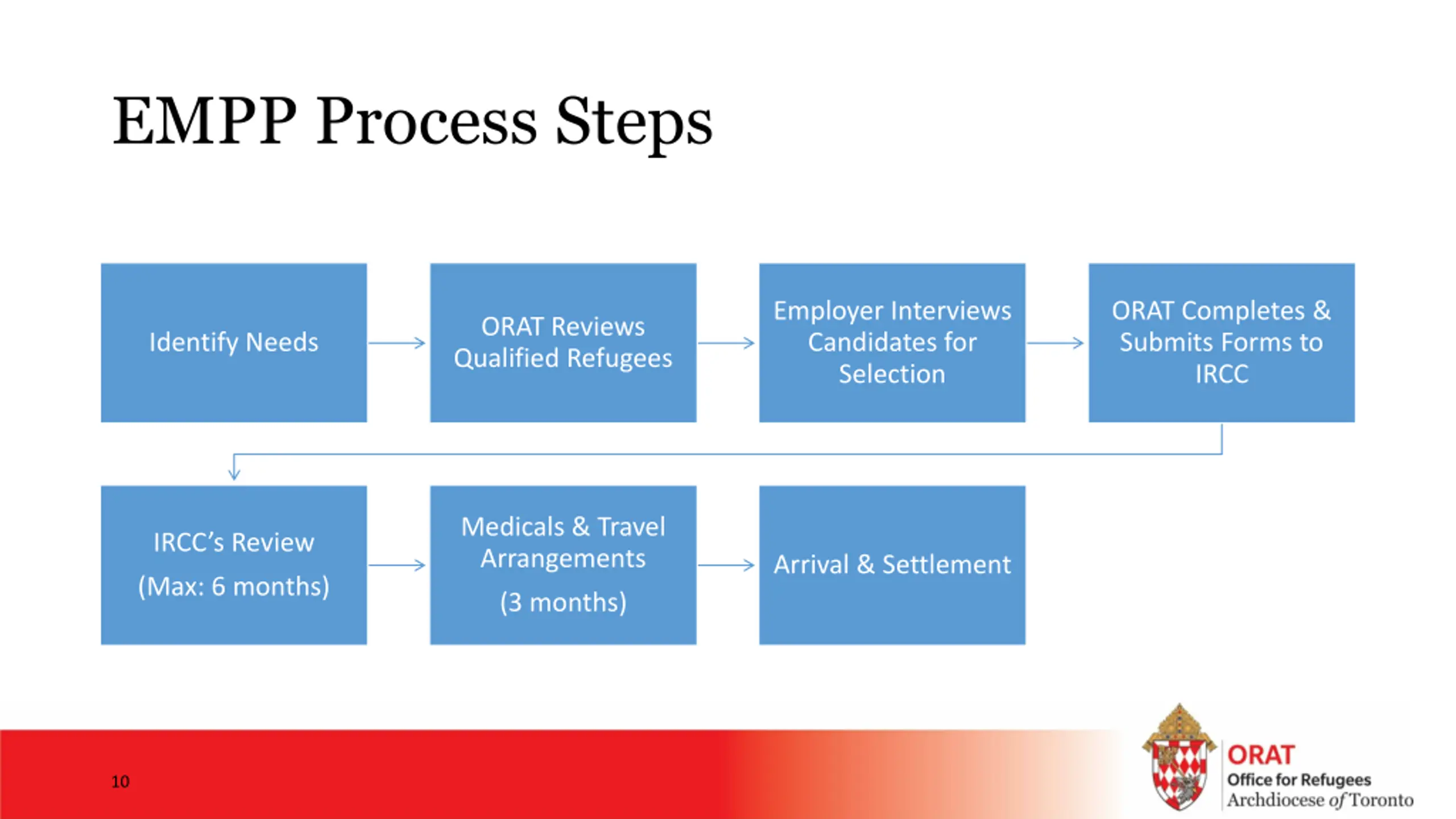 EMPP Process Steps Employer Interviews Candidates for Selection ORAT Completes & Submits Forms to IRCC ORAT Reviews Qualified Refugees Identify Needs Medicals & Travel Arrangements IRCC s Review Arrival & Settlement (Max: 6 months) (3 months) 10
