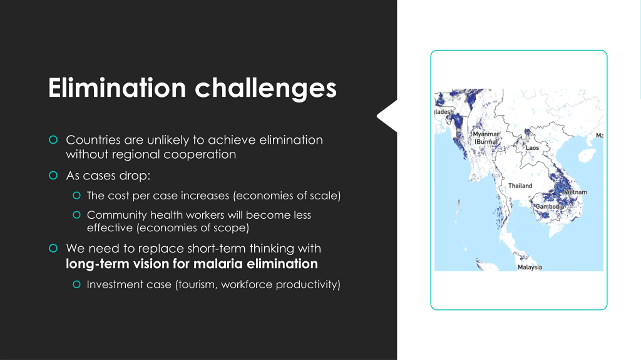 Elimination challenges Countries are unlikely to achieve elimination without regional cooperation As cases drop: The cost per case increases (economies of scale) Community health workers will become less effective (economies of scope) We need to replace short-term thinking with long-term vision for malaria elimination Investment case (tourism, workforce productivity)