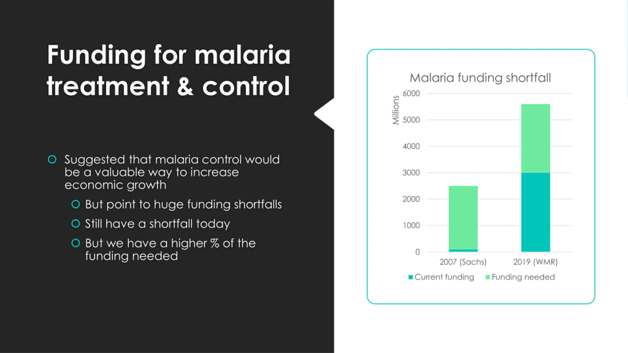 Funding for malaria treatment & control Malaria funding shortfall 6000 Millions 5000 4000 Suggested that malaria control would be a valuable way to increase economic growth But point to huge funding shortfalls Still have a shortfall today But we have a higher % of the funding needed 3000 2000 1000 0 2007 (Sachs) 2019 (WMR) Current funding Funding needed
