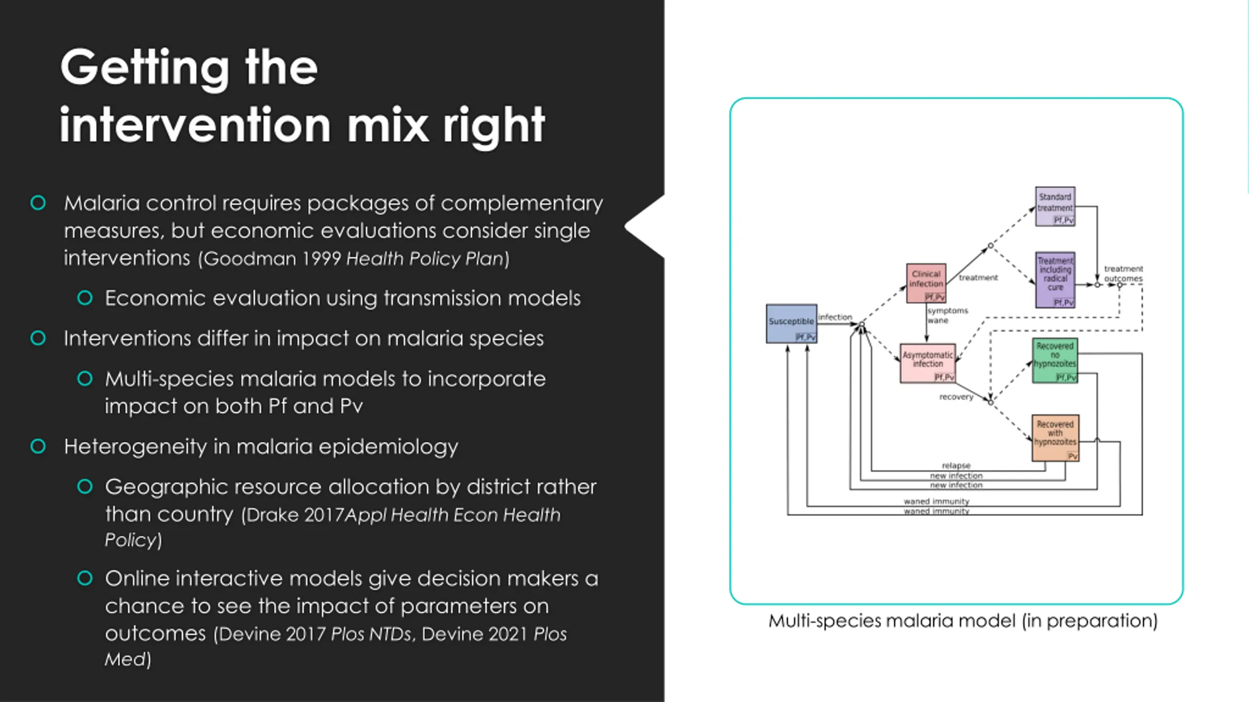 Getting the intervention mix right Malaria control requires packages of complementary measures, but economic evaluations consider single interventions (Goodman 1999 Health Policy Plan) Economic evaluation using transmission models Interventions differ in impact on malaria species Multi-species malaria models to incorporate impact on both Pf and Pv Heterogeneity in malaria epidemiology Geographic resource allocation by district rather than country (Drake 2017Appl Health Econ Health Policy) Online interactive models give decision makers a chance to see the impact of parameters on outcomes (Devine 2017 Plos NTDs, Devine 2021 Plos Med) Multi-species malaria model (in preparation)
