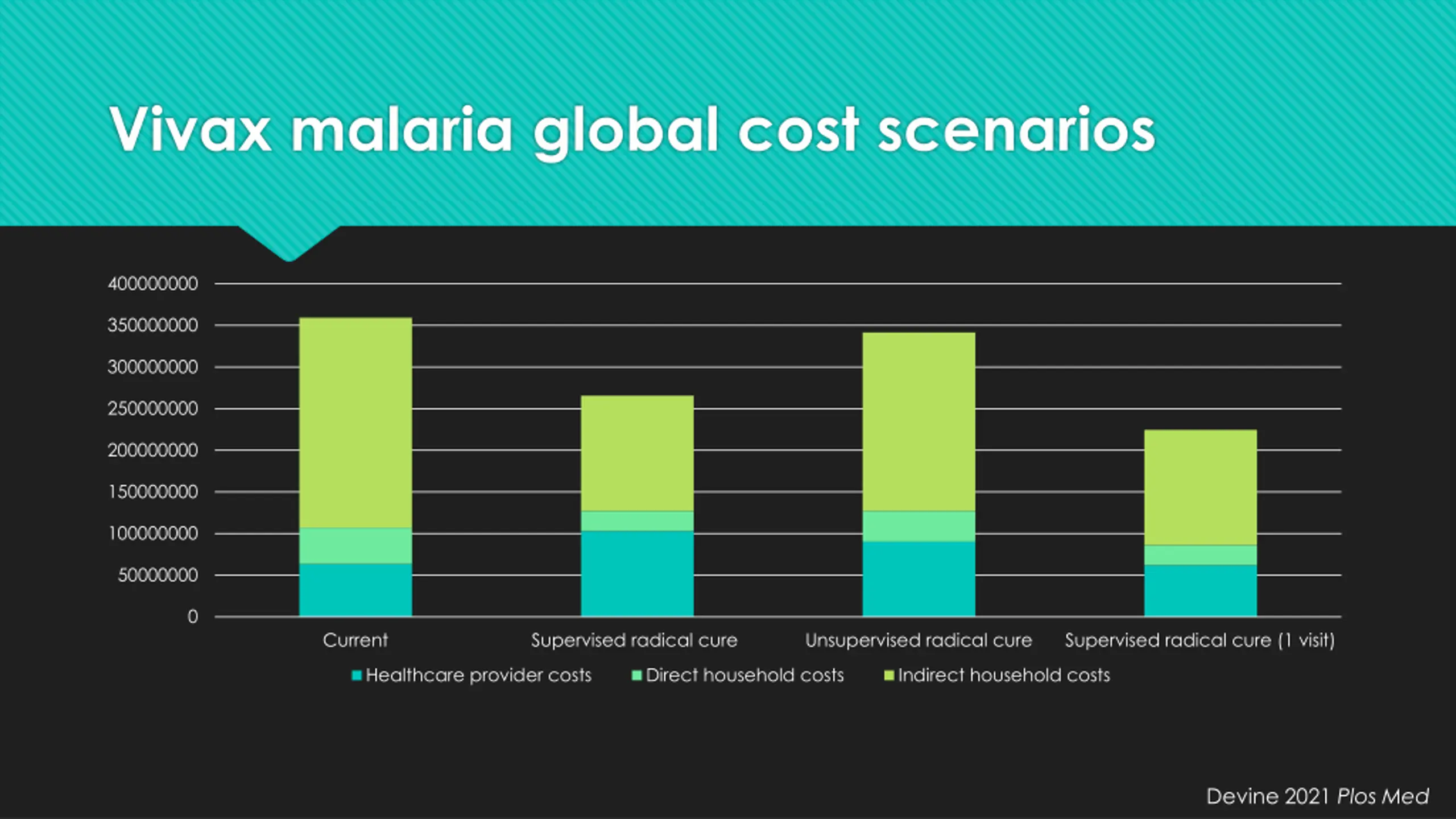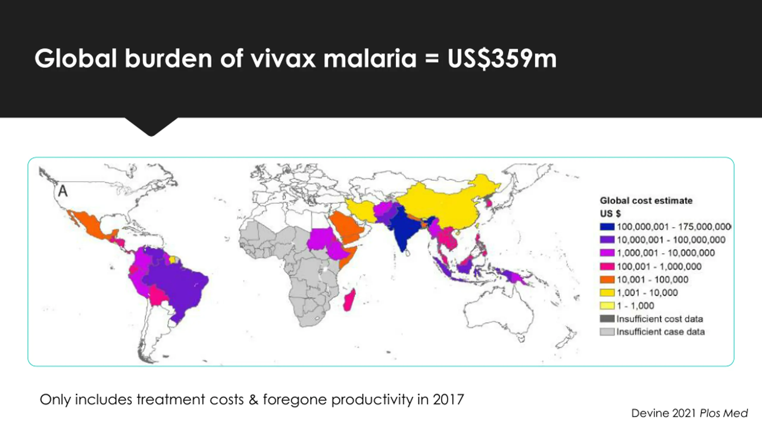 Global burden of vivax malaria = US$359m Only includes treatment costs & foregone productivity in 2017 Devine 2021 Plos Med