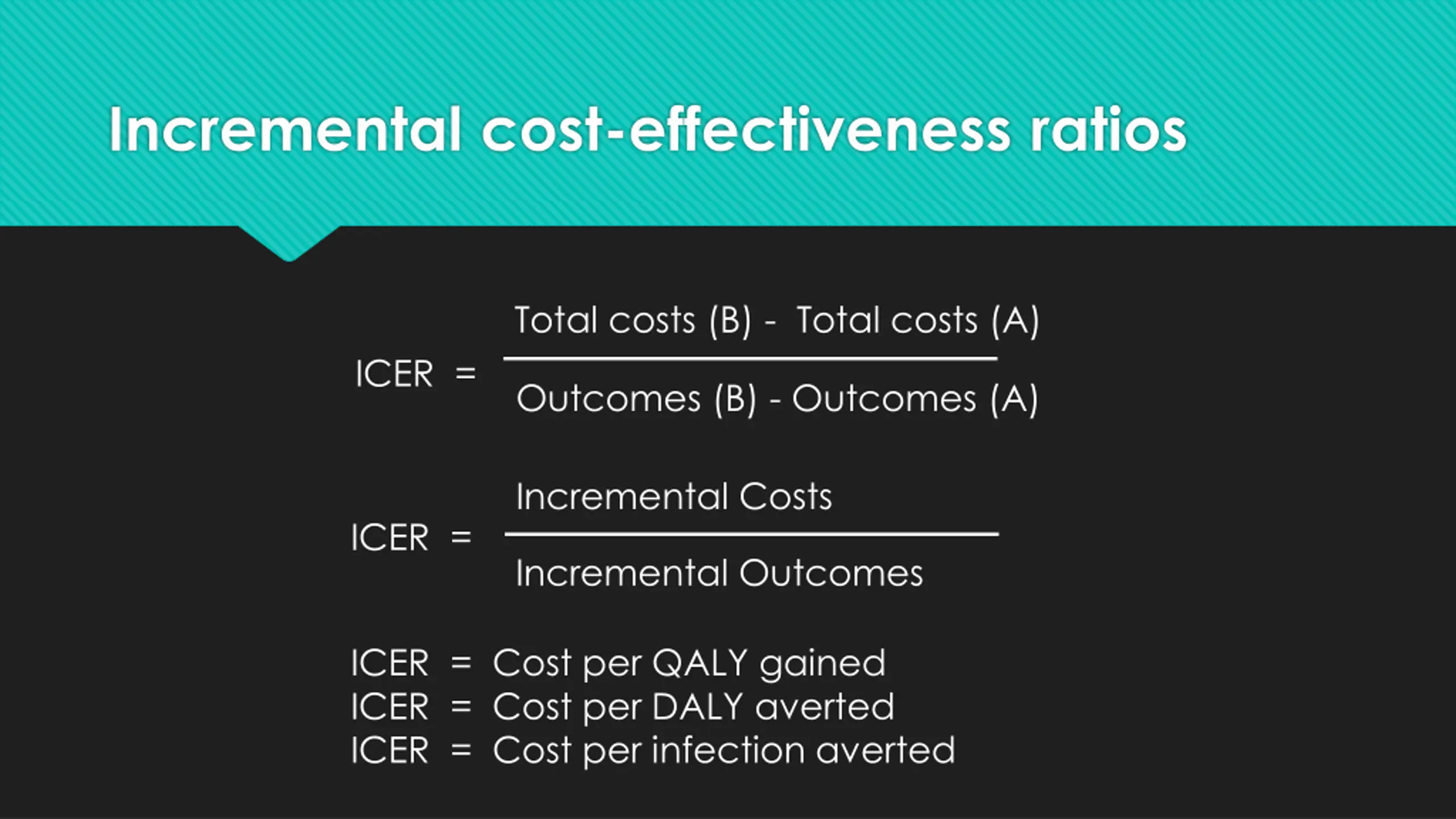 Incremental cost-effectiveness ratios Total costs (B) - Total costs (A) ICER = Outcomes (B) - Outcomes (A) Incremental Costs ICER = Incremental Outcomes ICER = Cost per QALY gained ICER = Cost per DALY averted ICER = Cost per infection averted