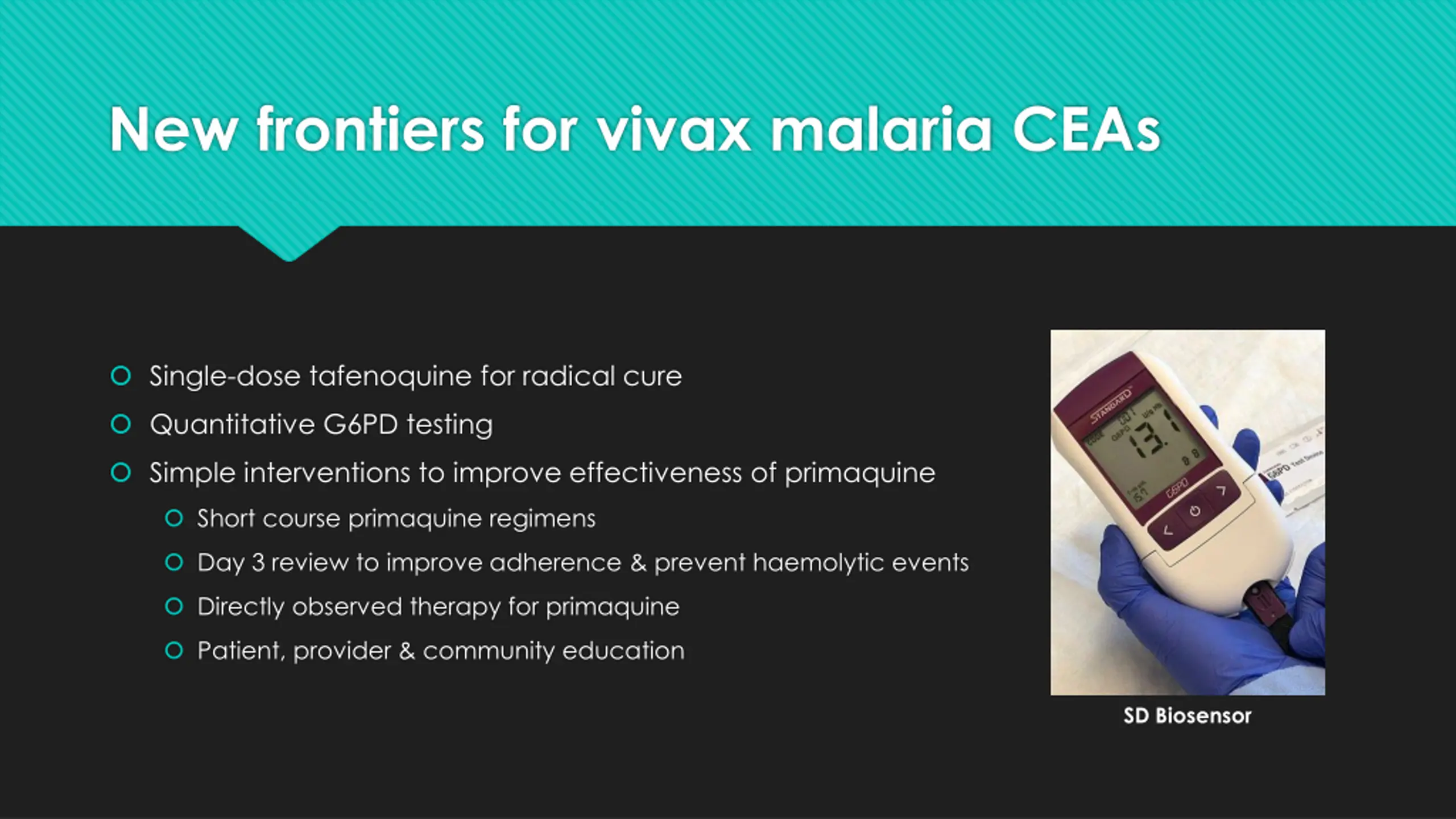 New frontiers for vivax malaria CEAs Single-dose tafenoquine for radical cure Quantitative G6PD testing Simple interventions to improve effectiveness of primaquine Short course primaquine regimens Day 3 review to improve adherence & prevent haemolytic events Directly observed therapy for primaquine Patient, provider & community education SD Biosensor