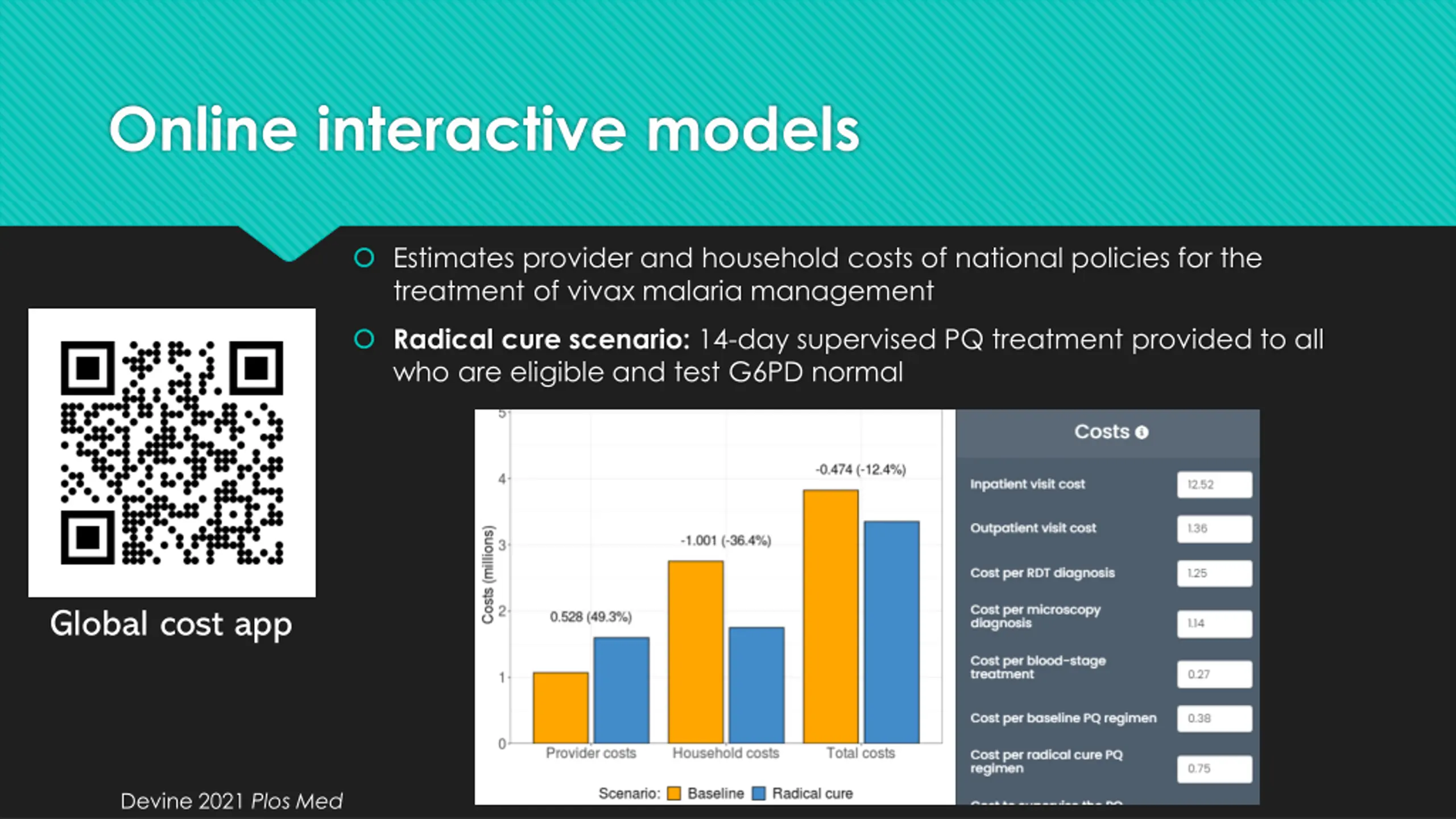 Online interactive models Estimates provider and household costs of national policies for the treatment of vivax malaria management Radical cure scenario: 14-day supervised PQ treatment provided to all who are eligible and test G6PD normal Global cost app Devine 2021 Plos Med