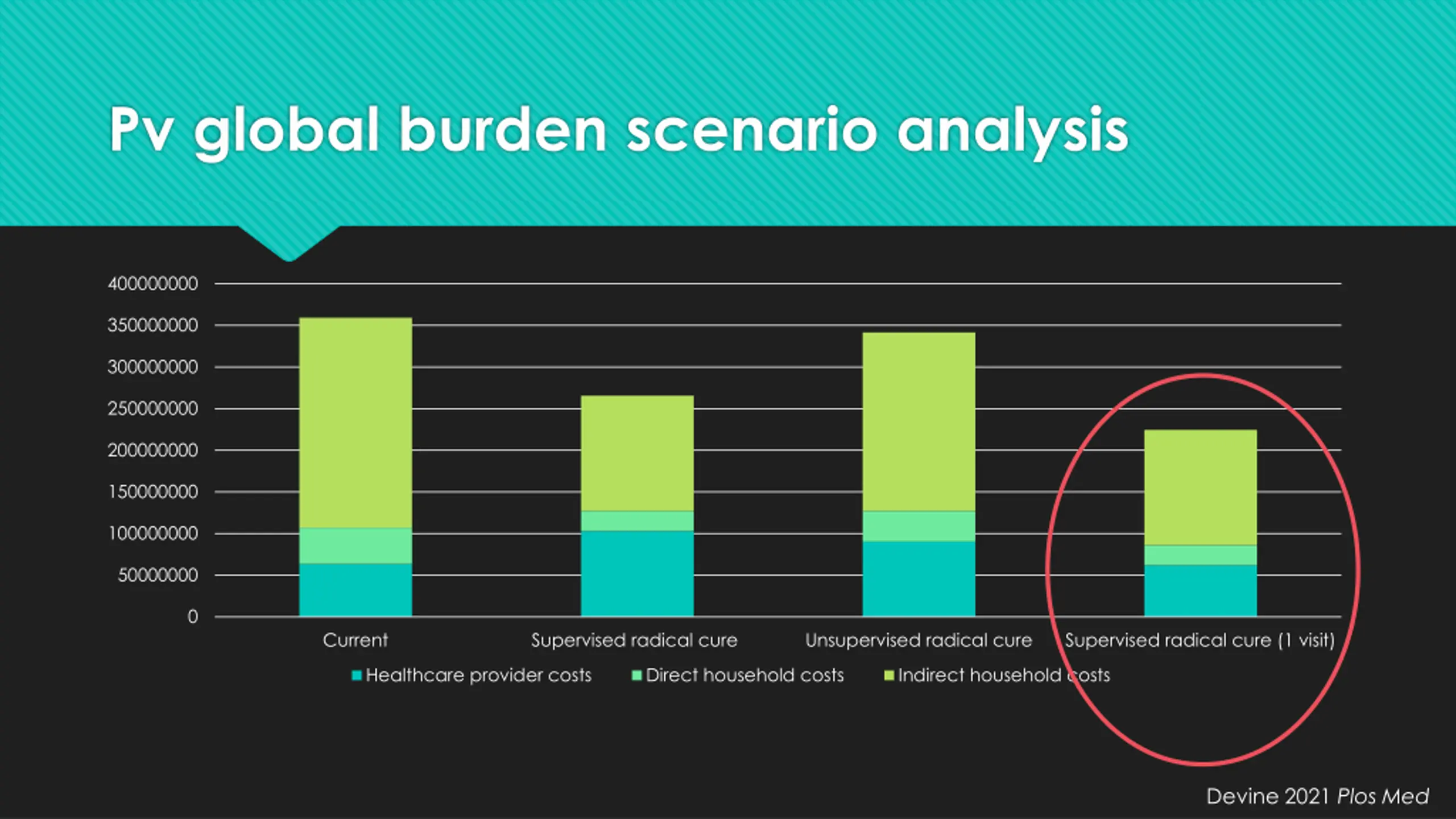 Pv global burden scenario analysis 400000000 350000000 300000000 250000000 200000000 150000000 100000000 50000000 0 Current Supervised radical cure Unsupervised radical cure Supervised radical cure (1 visit) Healthcare provider costs Direct household costs Indirect household costs Devine 2021 Plos Med